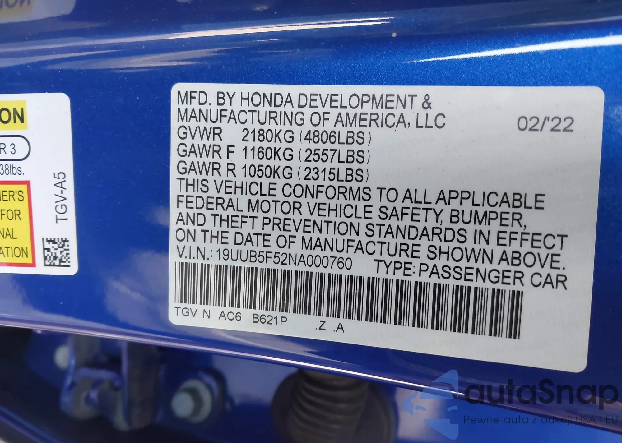 • VIN 19UUB5F52NA000760