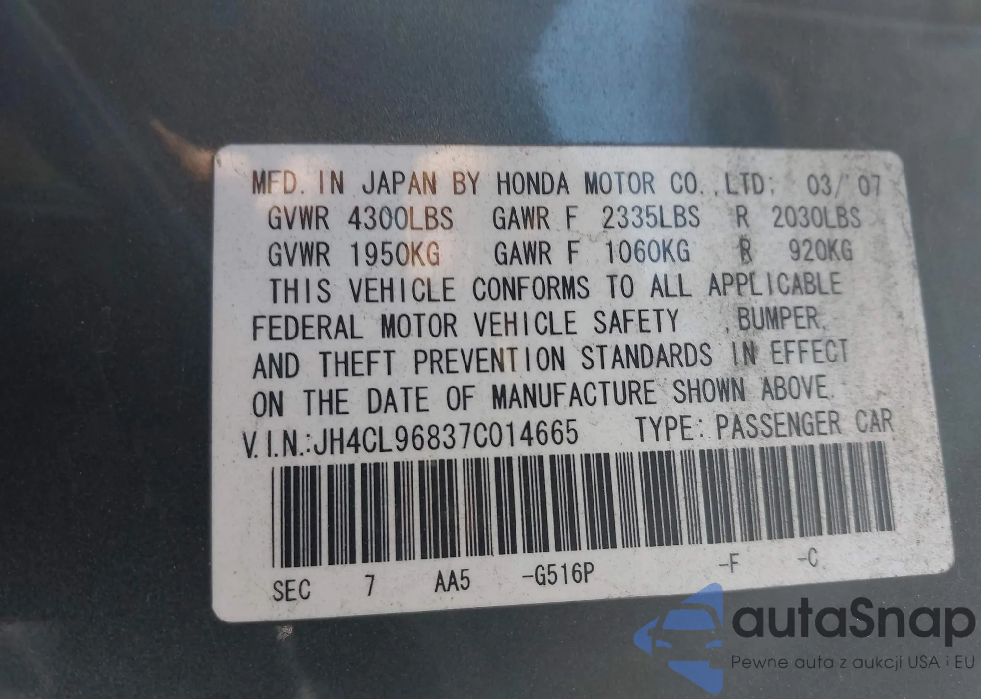 LOT: 44469415 VIN: JH4CL96837C014665