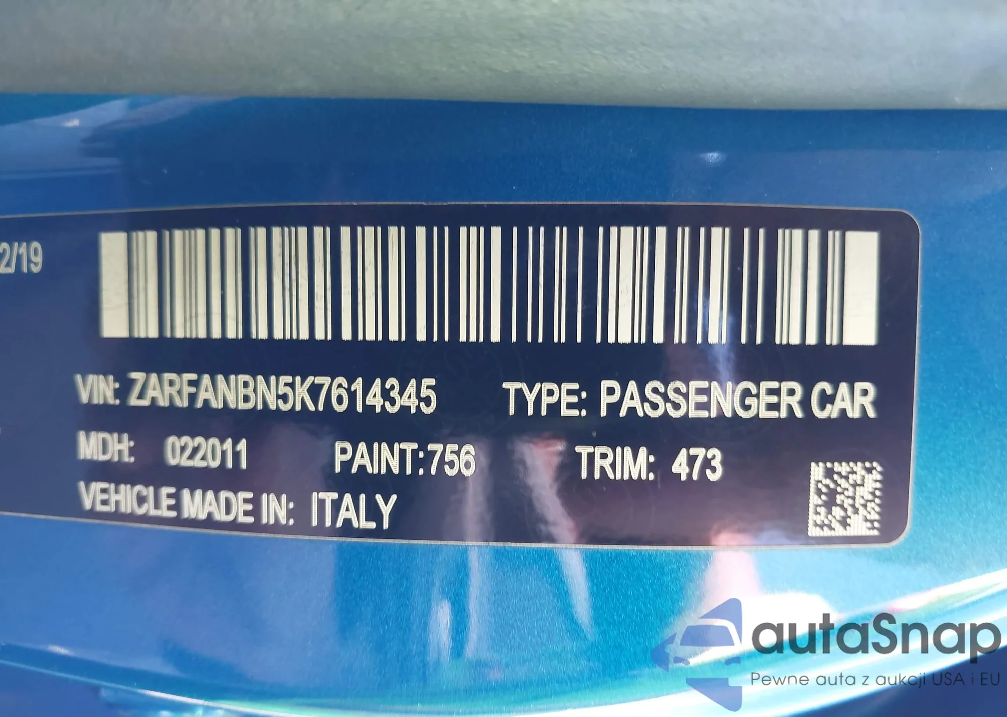 LOT: 44351001 VIN: ZARFANBN5K7614345