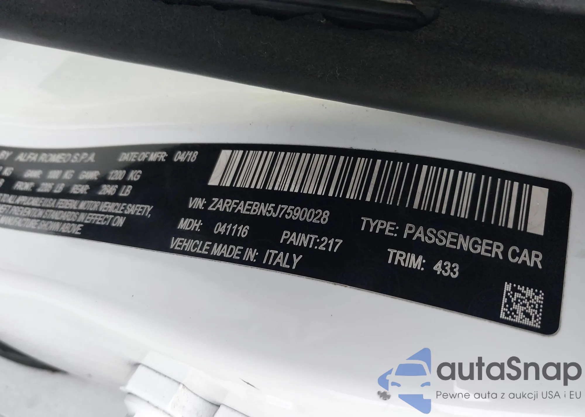 LOT: 44408229 VIN: ZARFAEBN5J7590028
