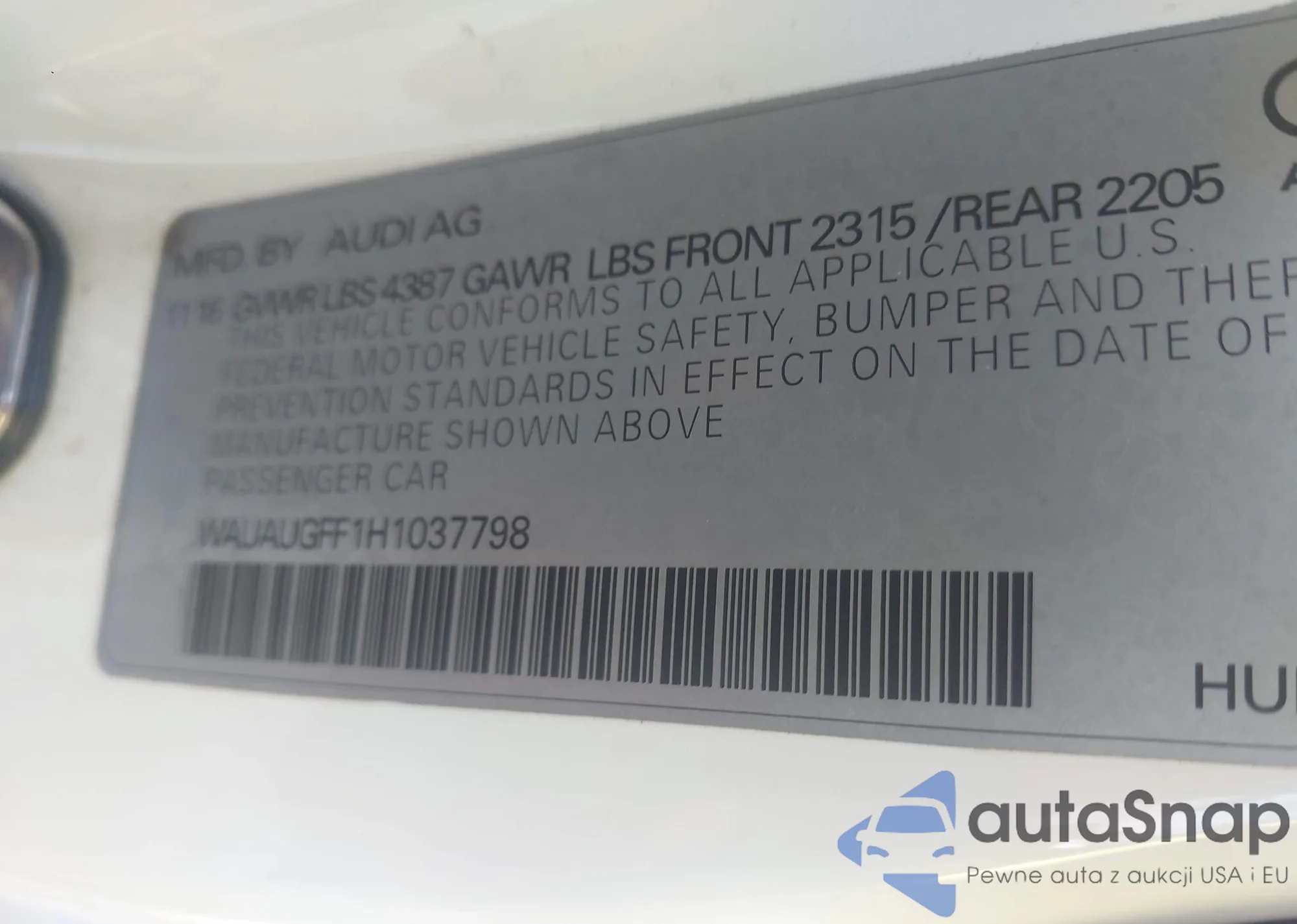 LOT: 44352742 VIN: WAUAUGFF1H1037798