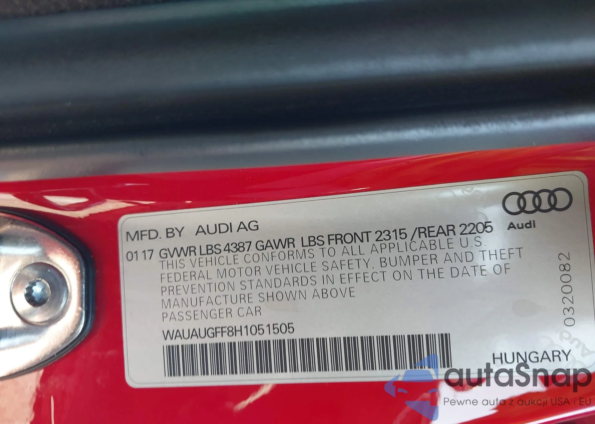 • VIN WAUAUGFF8H1051505