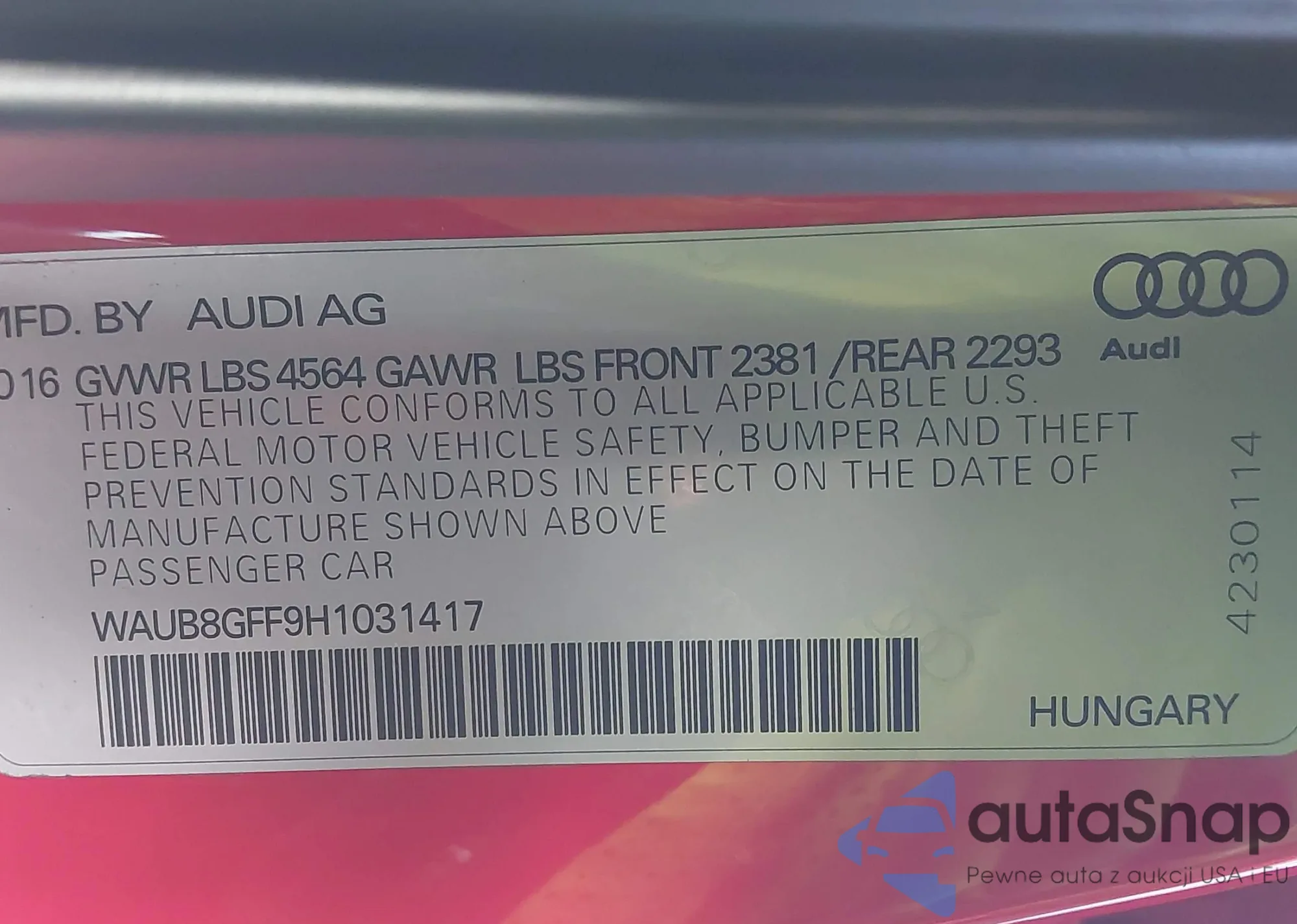 LOT: 44495064 VIN: WAUB8GFF9H1031417