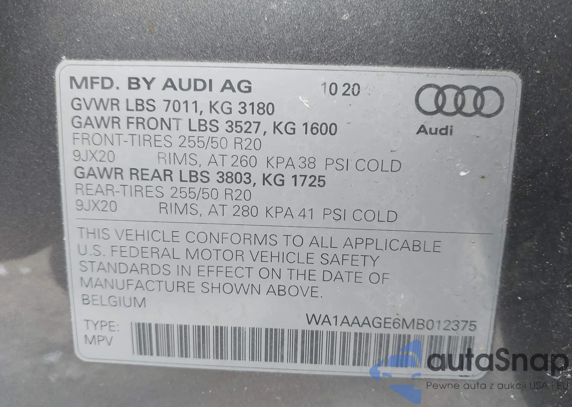 LOT: 44353957 VIN: WA1AAAGE6MB012375