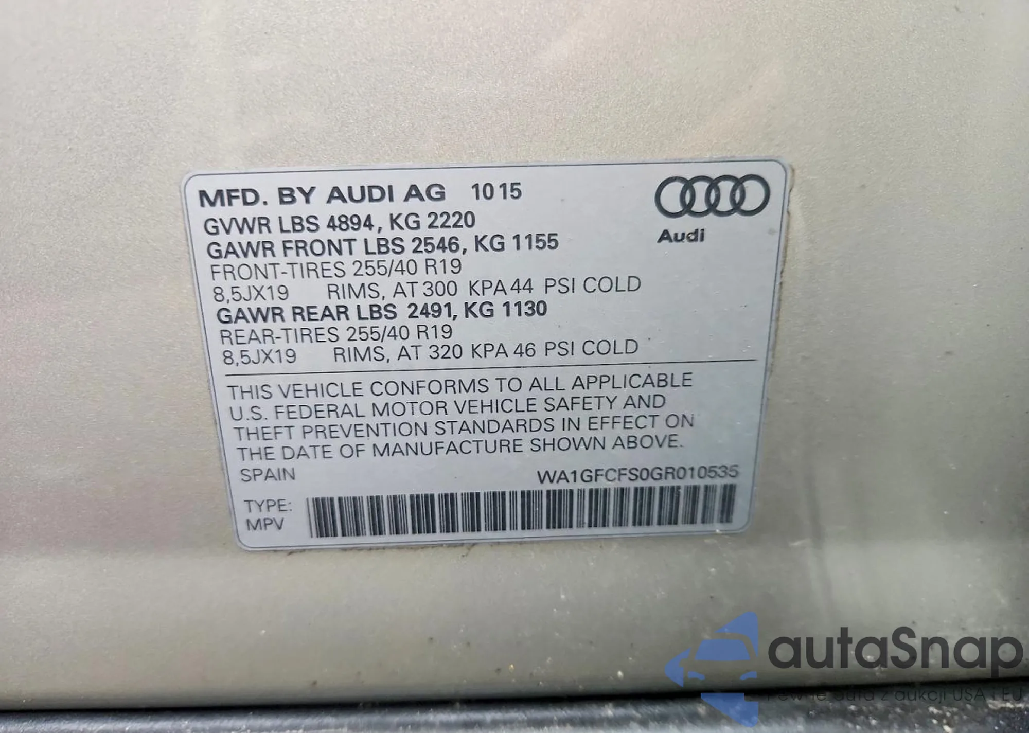 LOT: 76589855 VIN: WA1GFCFS0GR010535