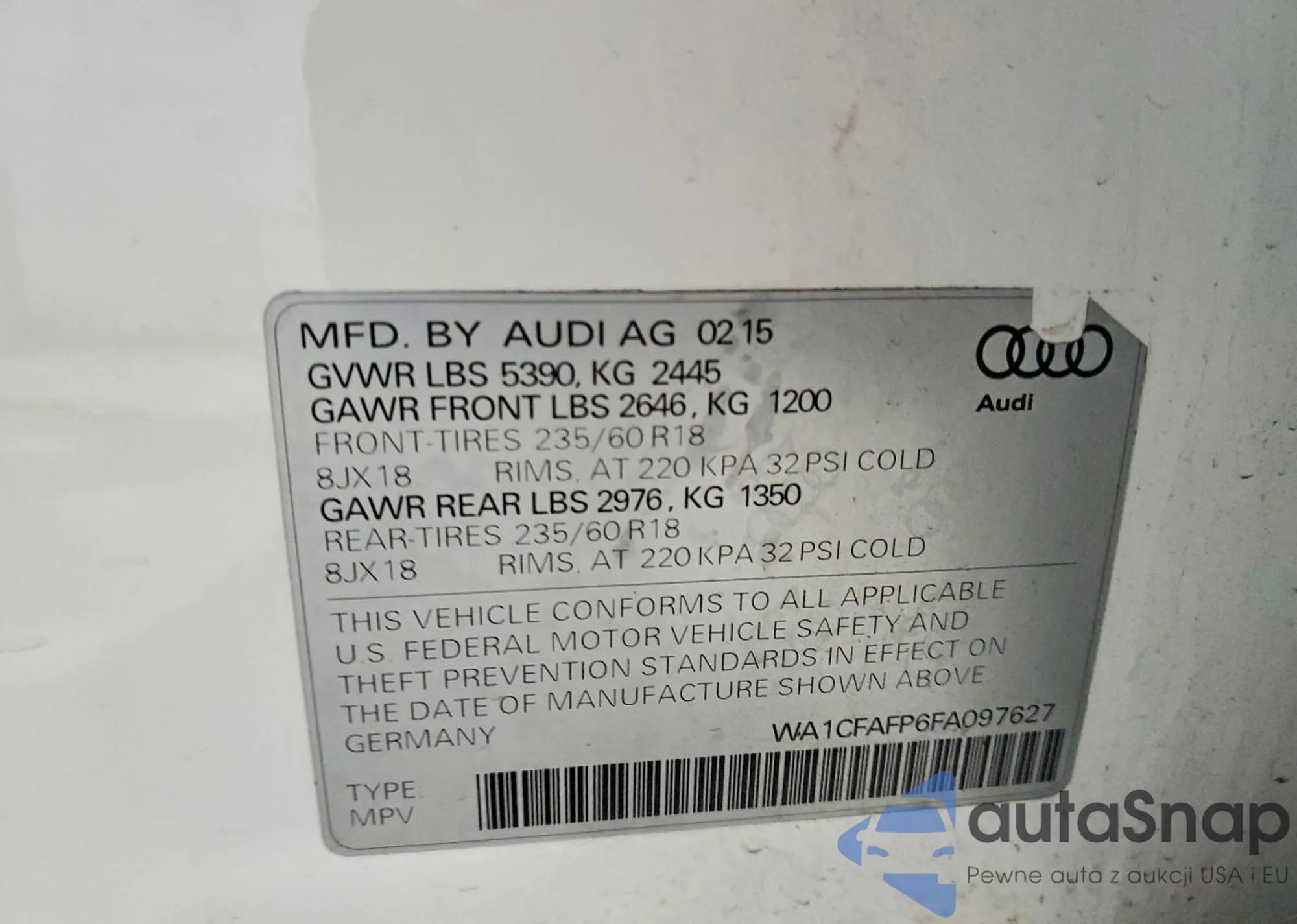 LOT: 76595365 VIN: WA1CFAFP6FA097627