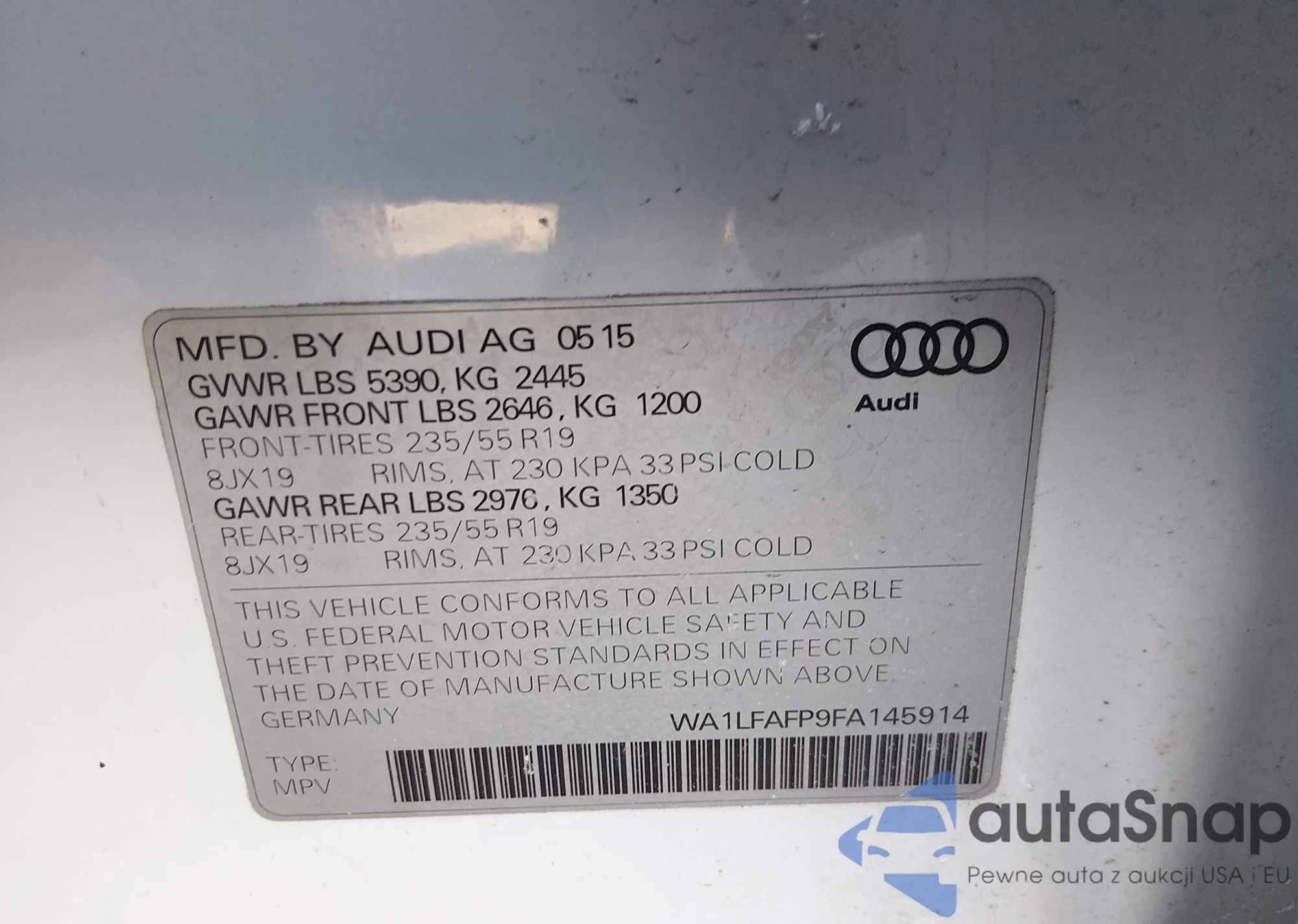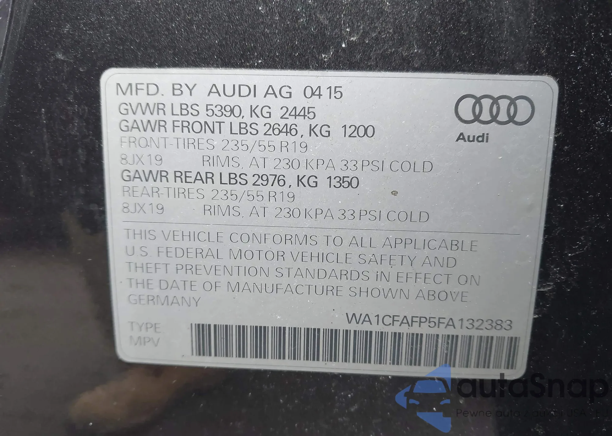 LOT: 44393307 VIN: WA1CFAFP5FA132383
