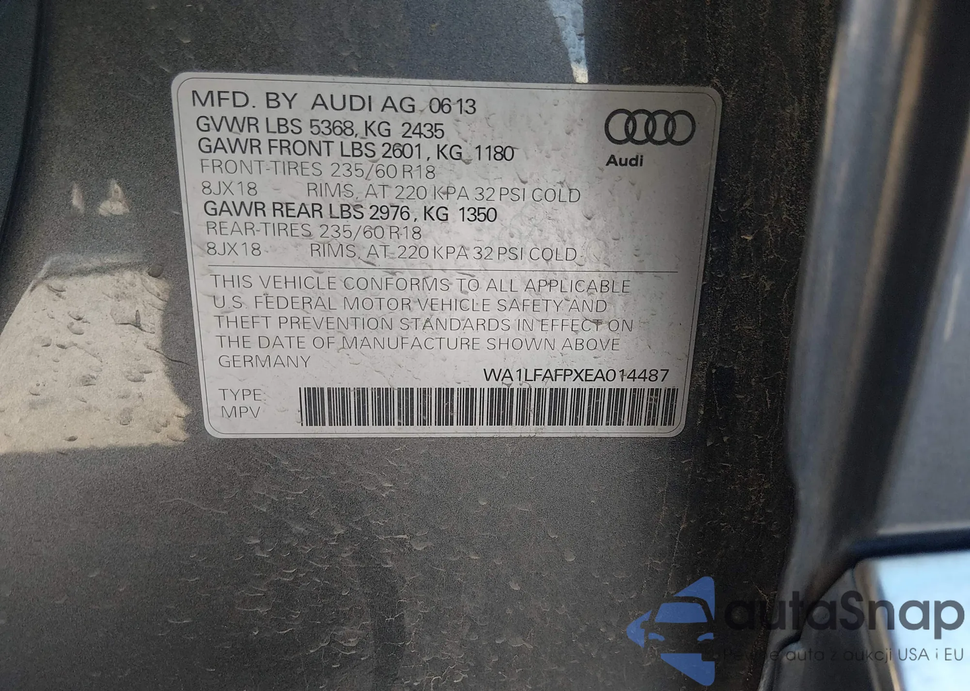 LOT: 44348061 VIN: WA1CFAFP2DA011985