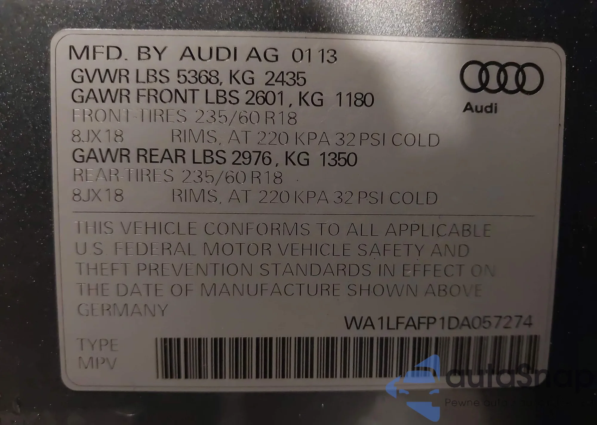 • VIN WA1LFAFP1DA057274