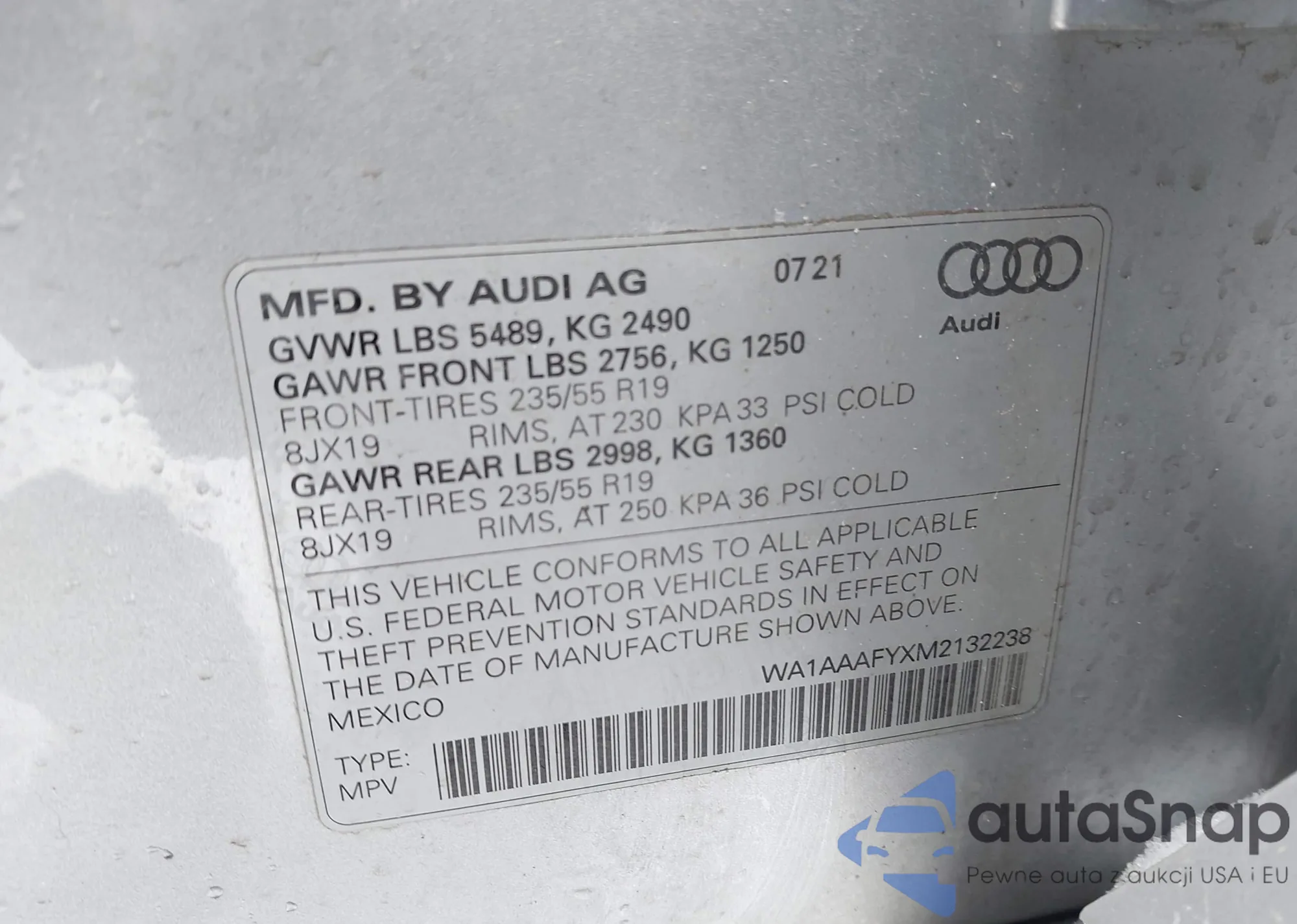 LOT: 44281425 VIN: WA1AAAFYXM2132238