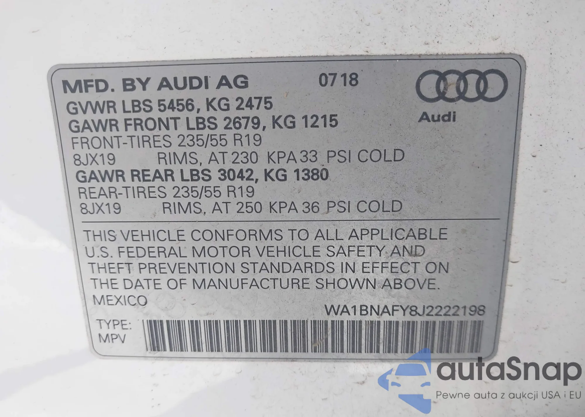 LOT: 44443726 VIN: WA1BNAFY8J2222198
