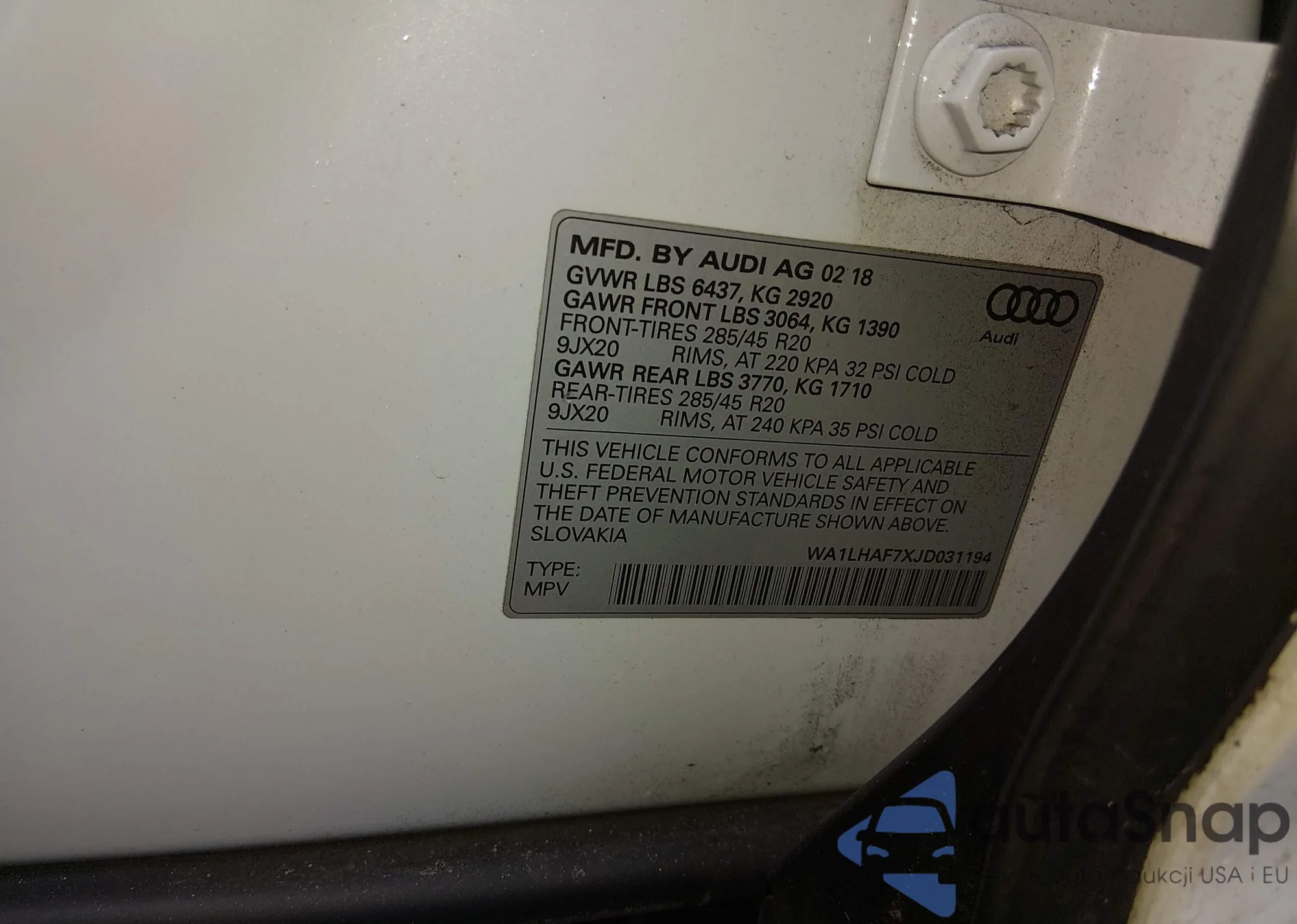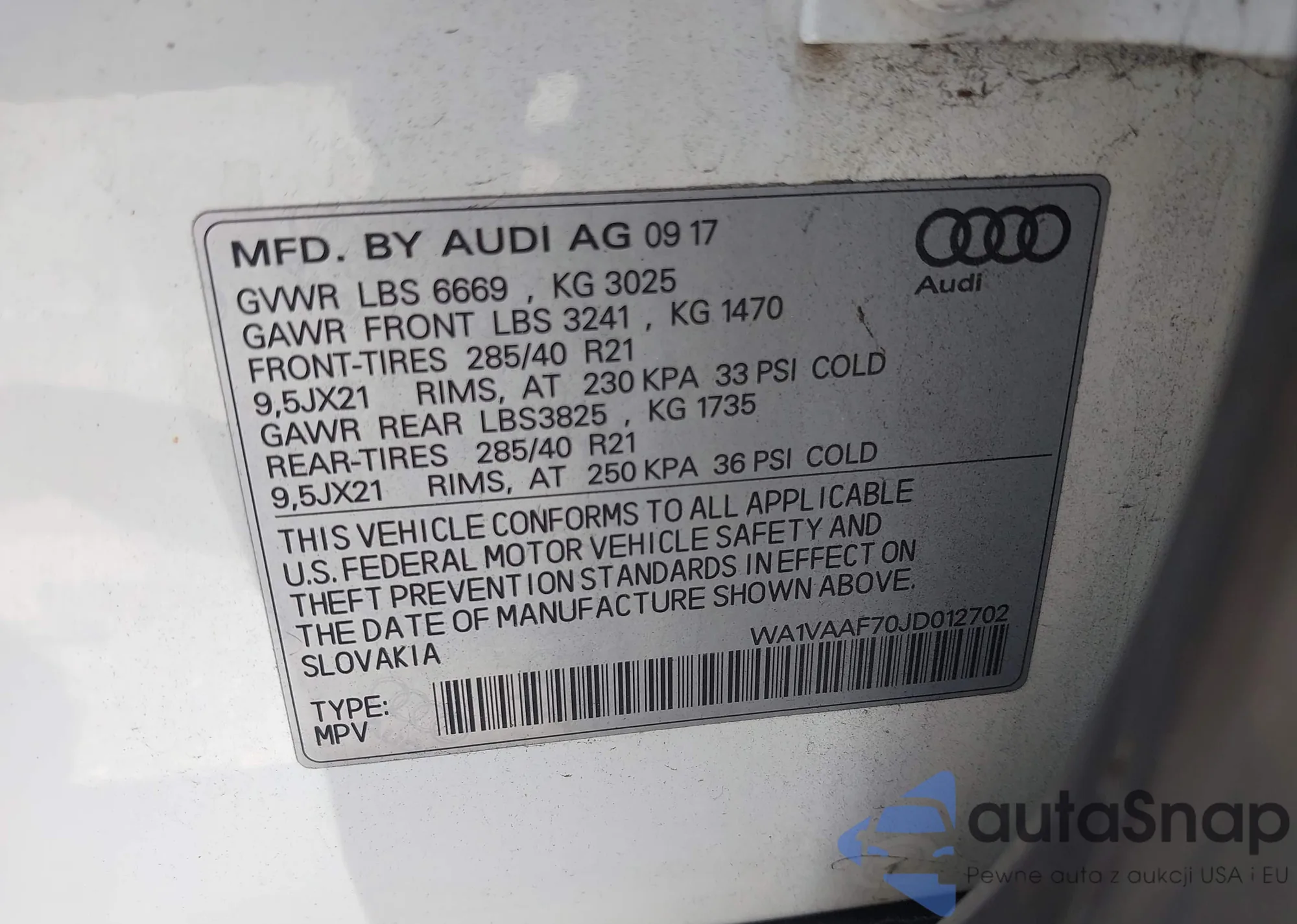 LOT: 44424095 VIN: WA1VAAF70JD012702