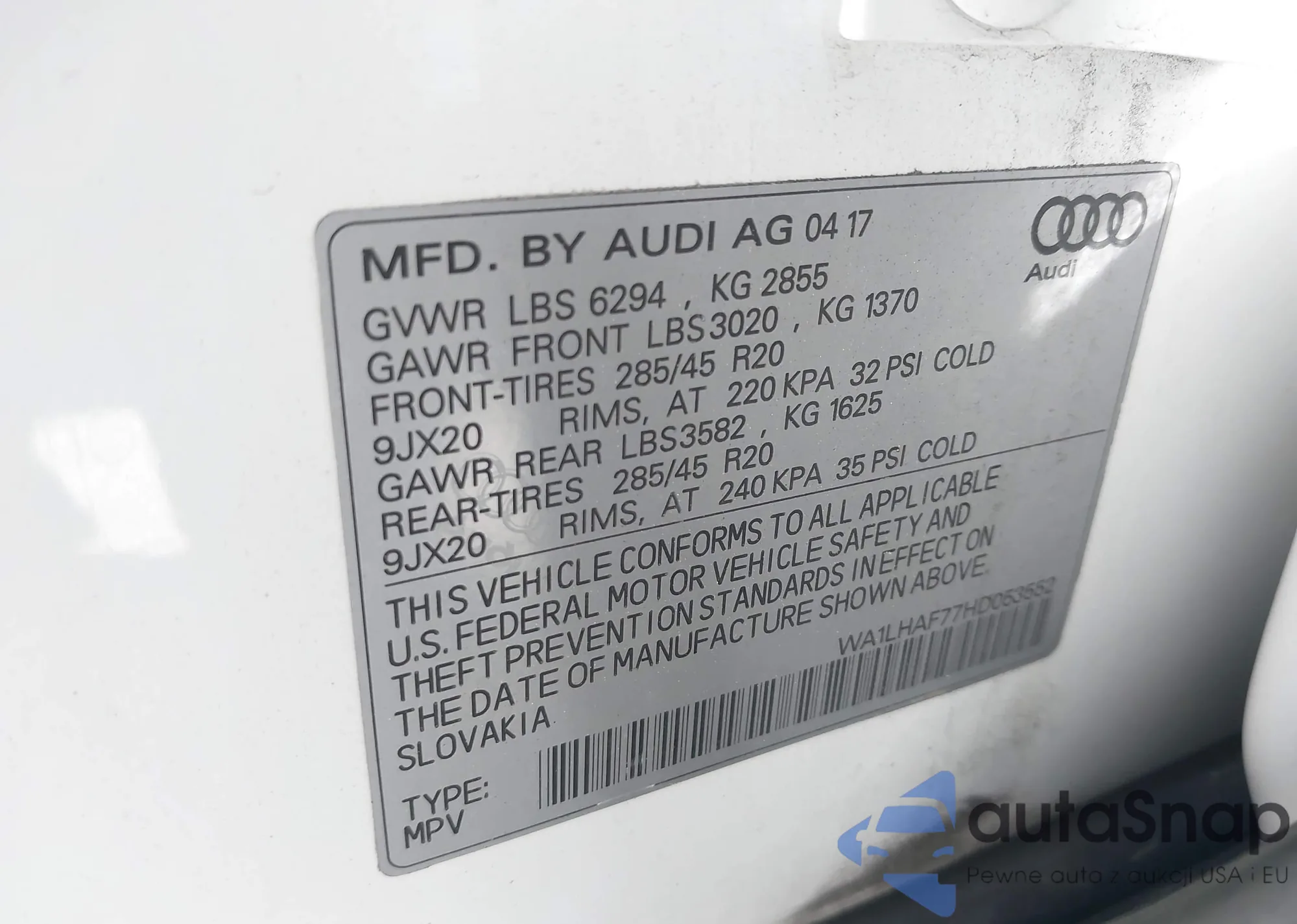 LOT: 44425844 VIN: WA1LAAF79HD041374