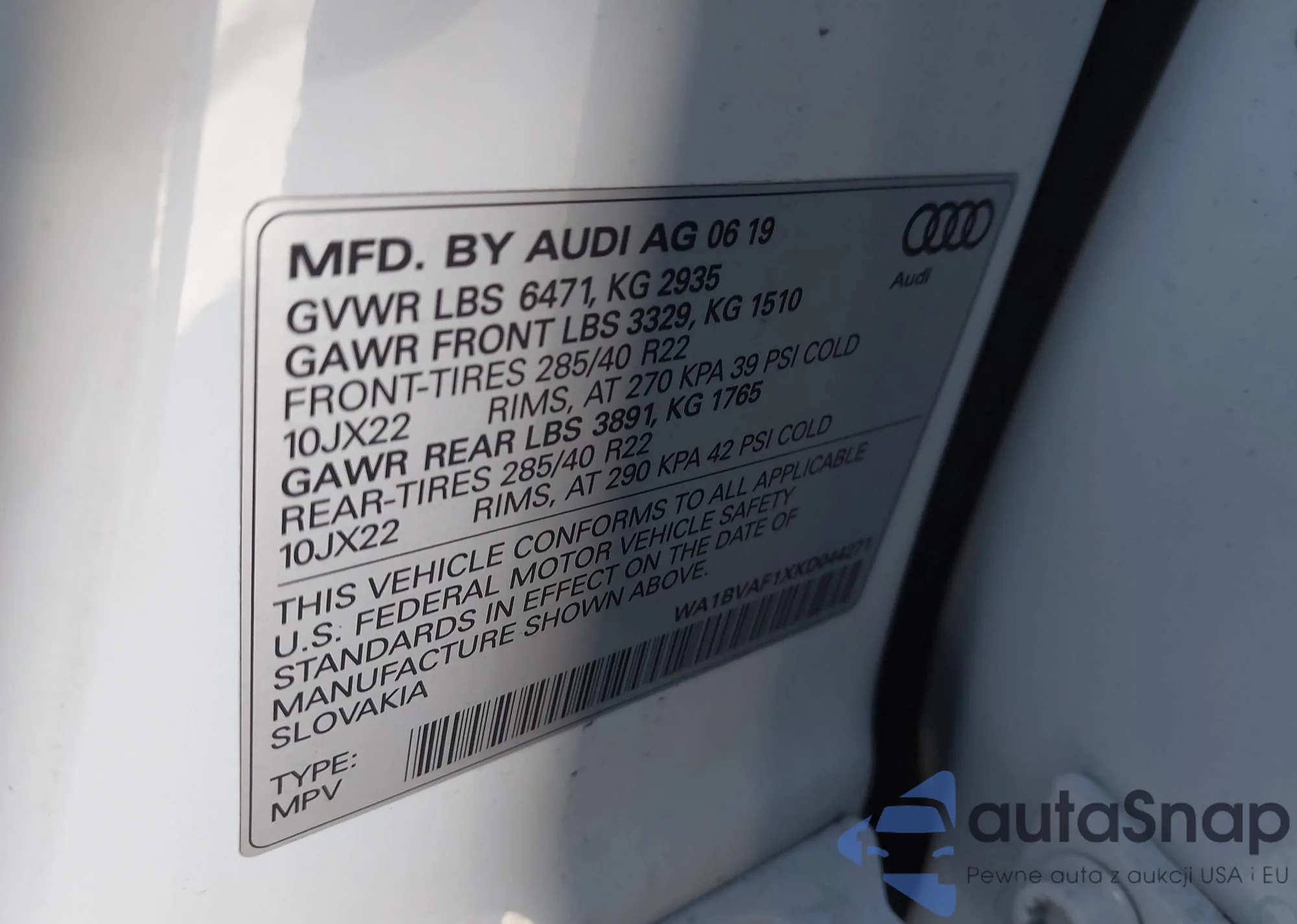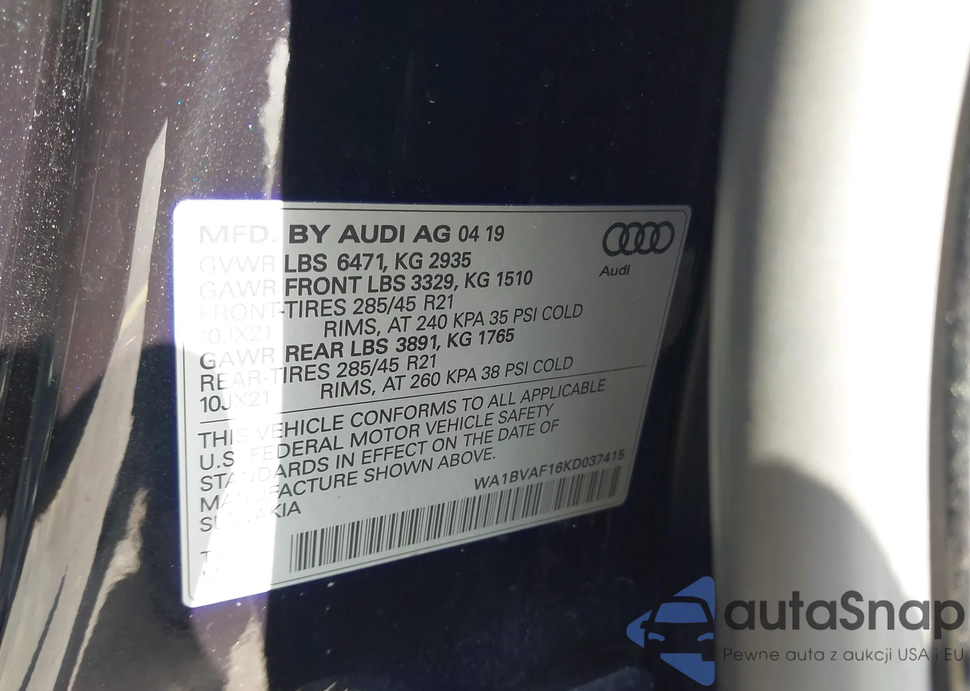 LOT: 44404238 VIN: WA1BVAF16KD037415