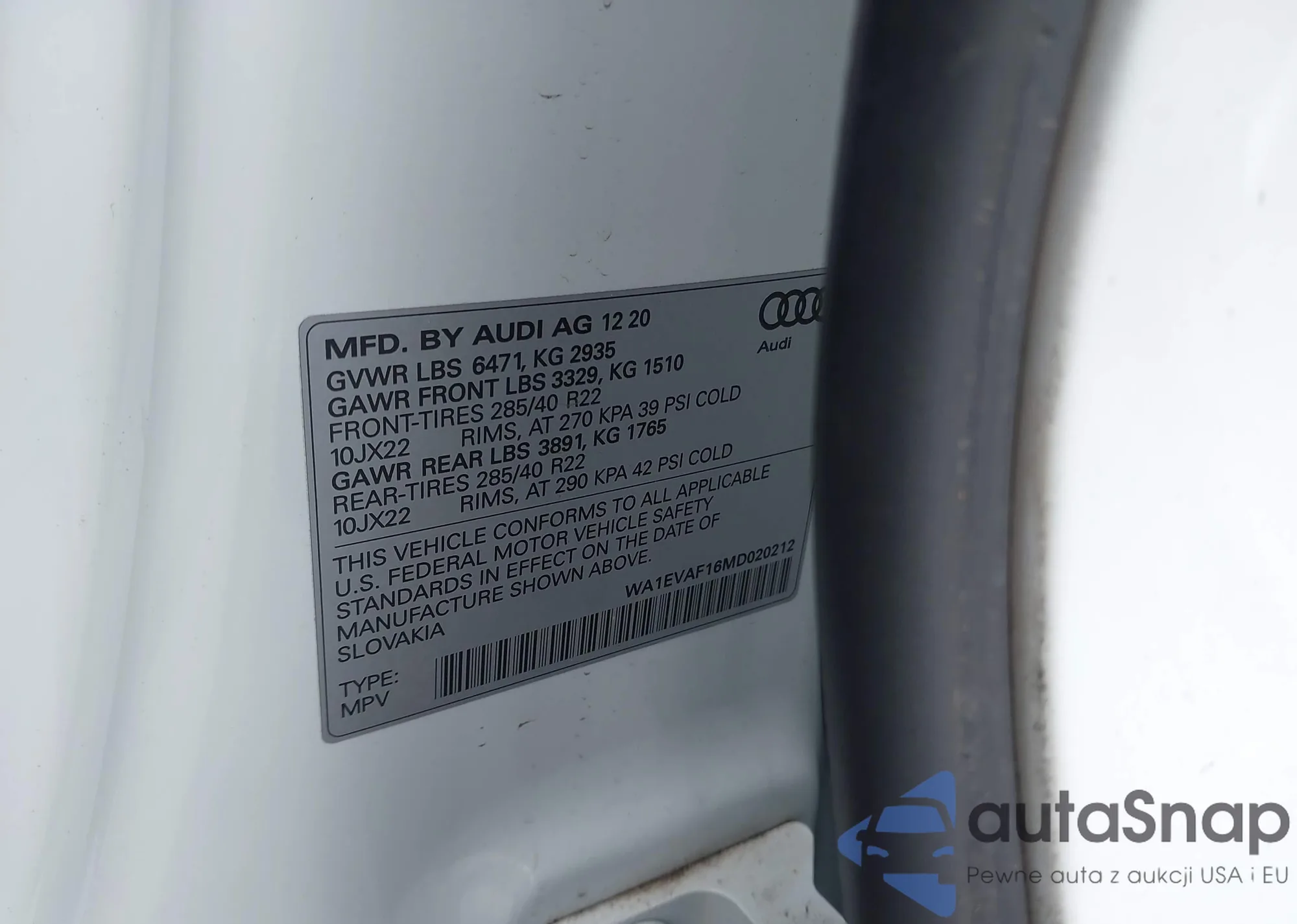 LOT: 44424019 VIN: WA1EVAF16MD020212
