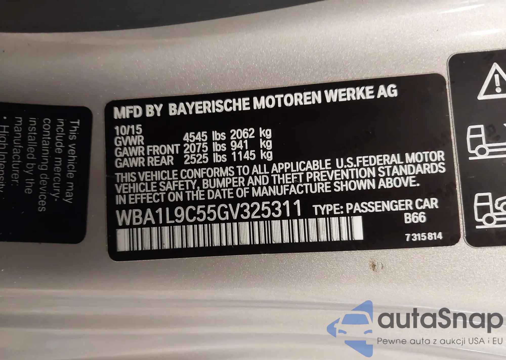 LOT: 44265126 VIN: WBA1L9C55GV325311
