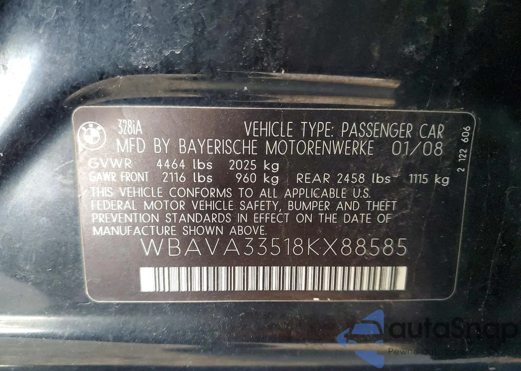 2008 BMW 328 I z USA, uszkodzony, nr VIN WBAVA33518KX88585