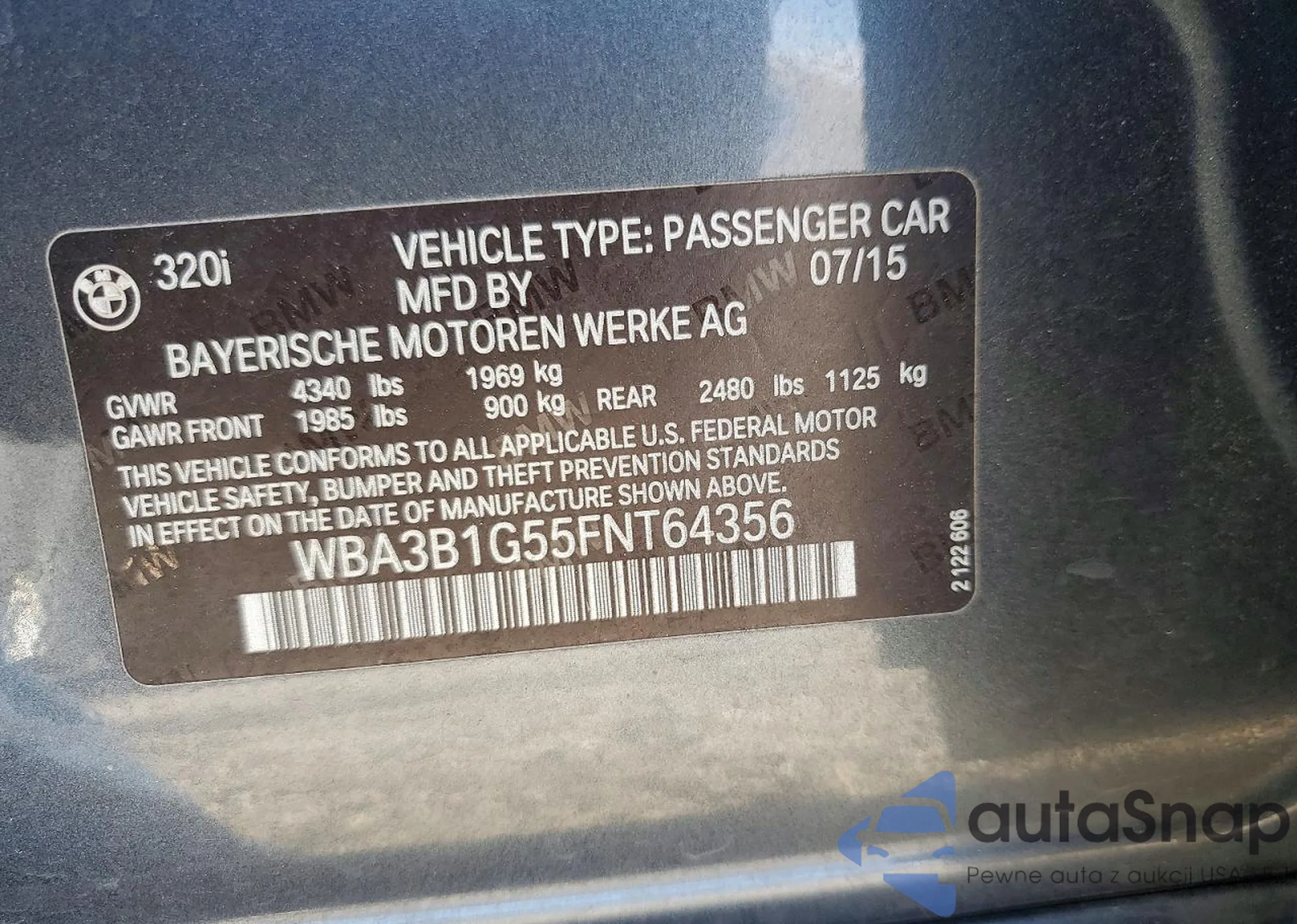 2015 BMW 320 I z USA, uszkodzony, nr VIN WBA3B1G55FNT64356