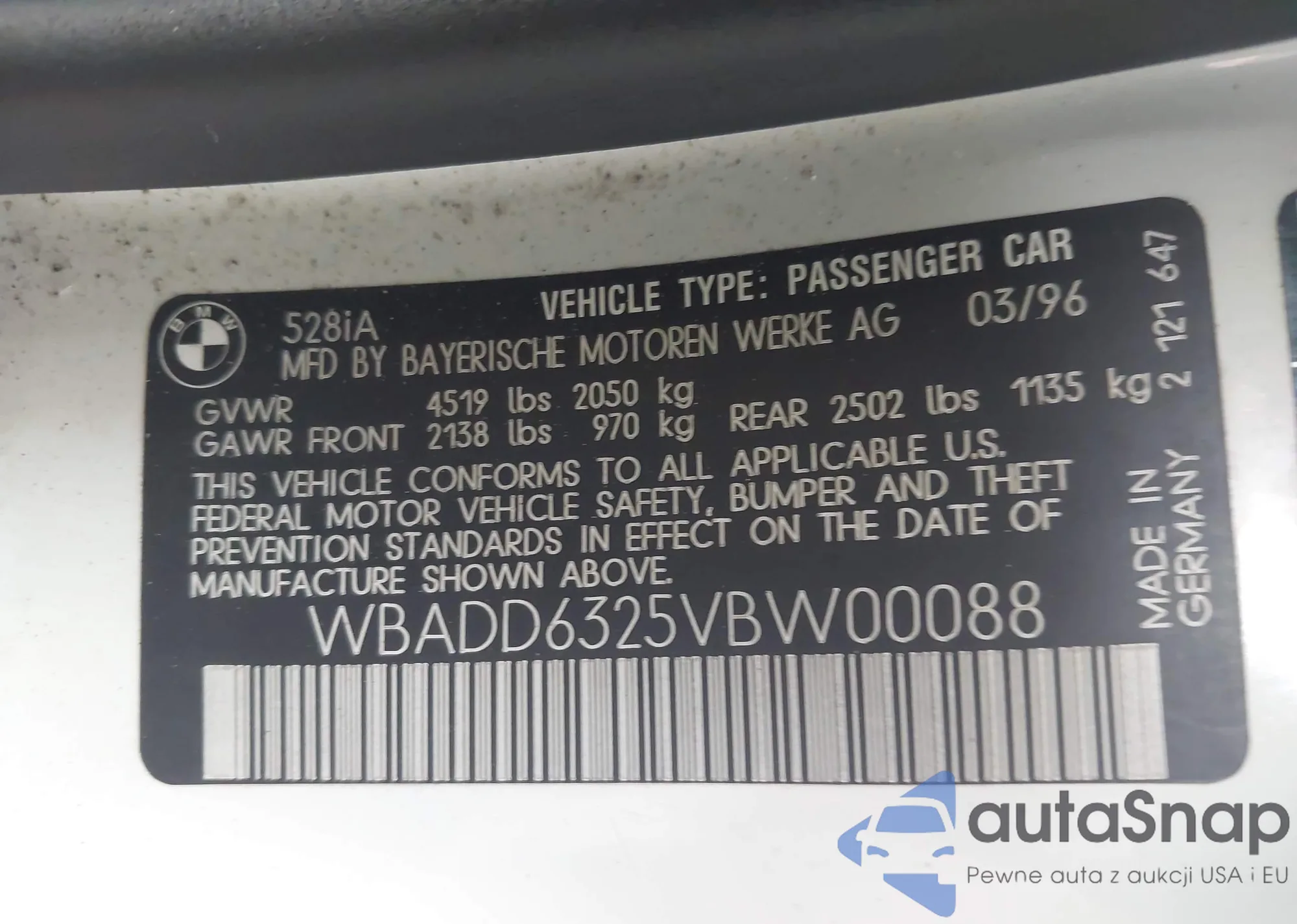 1997 BMW 528I z USA, uszkodzony, nr VIN WBADD6325VBW00088