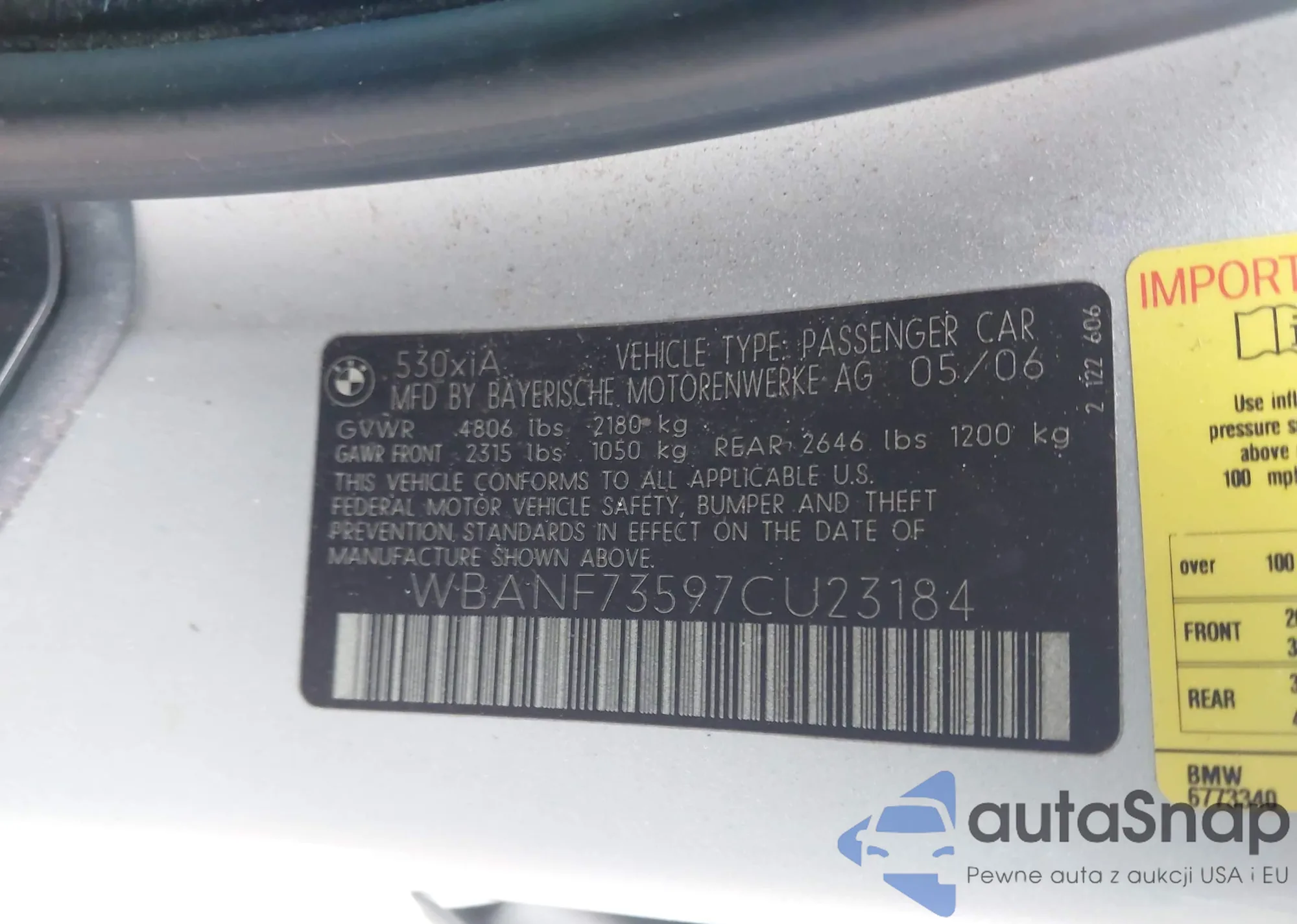 2006 BMW 530 I z USA, uszkodzony, nr VIN WBANE73516CM38781