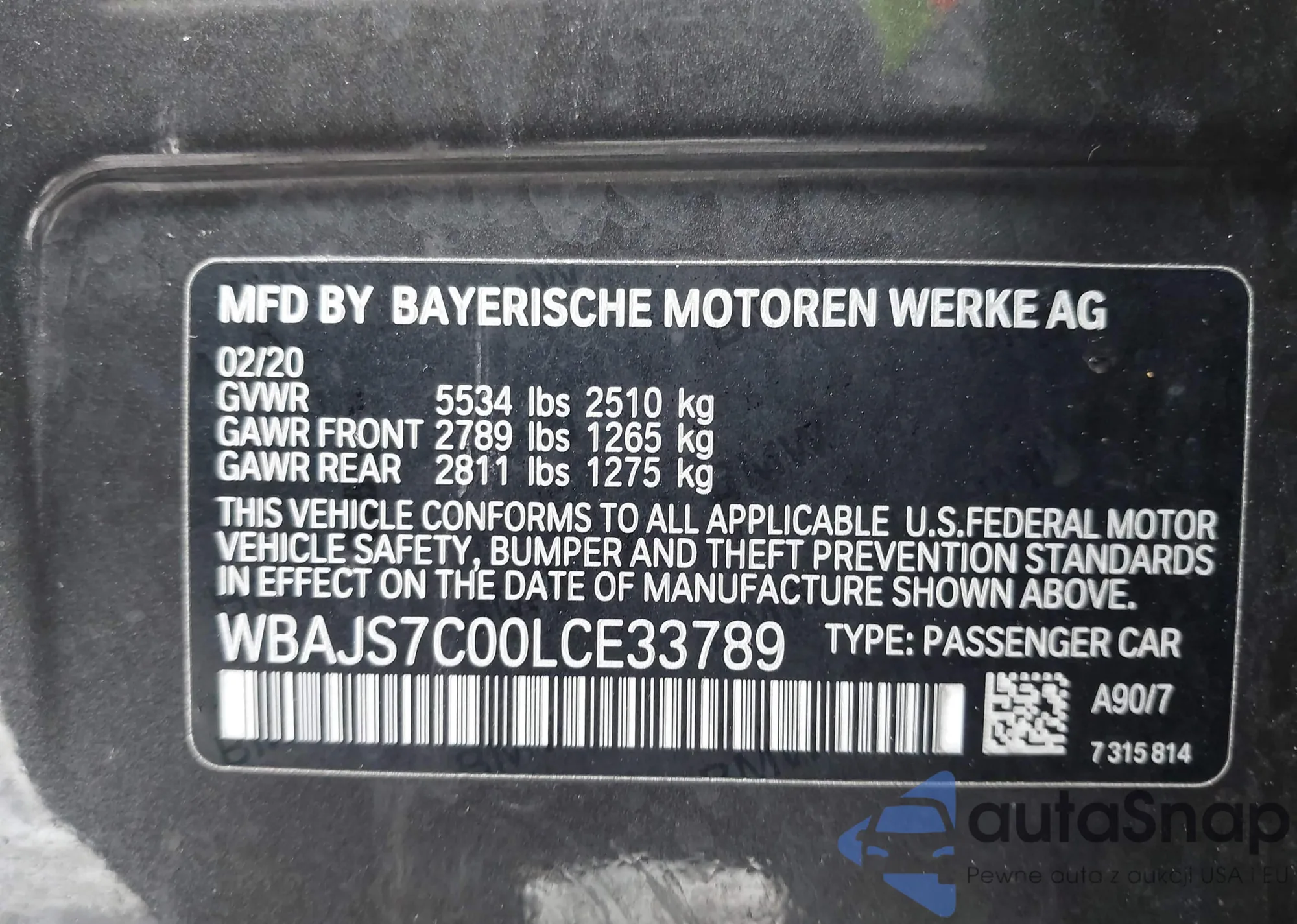 LOT: 44470934 VIN: WBAJS7C00LCE33789