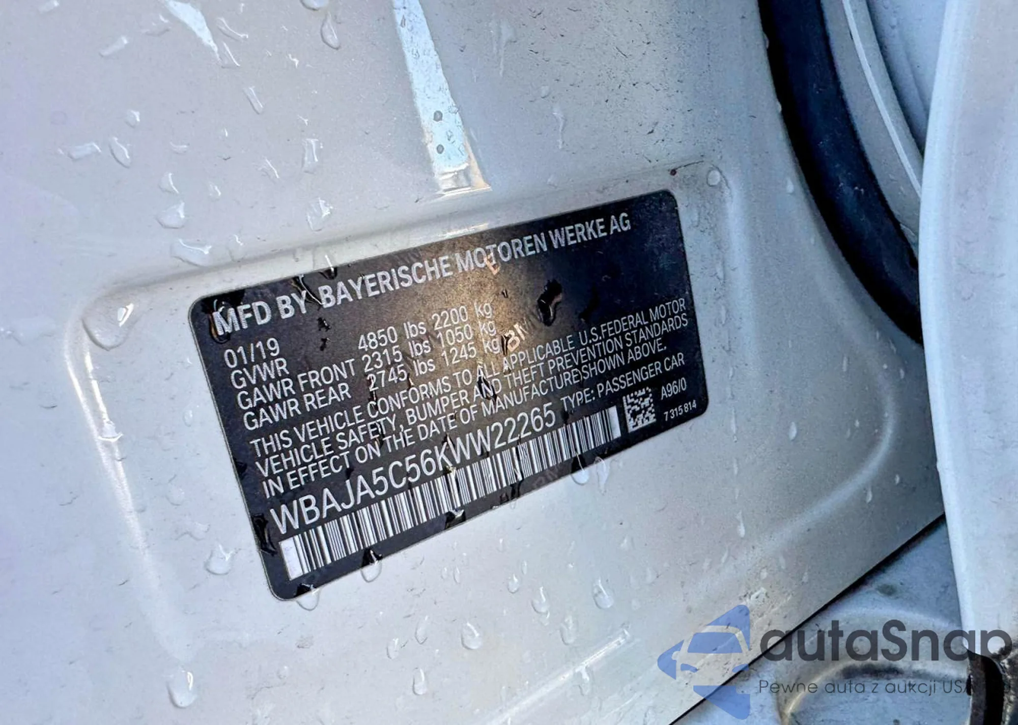 LOT: 78137085 VIN: WBAJA5C56KWW22265