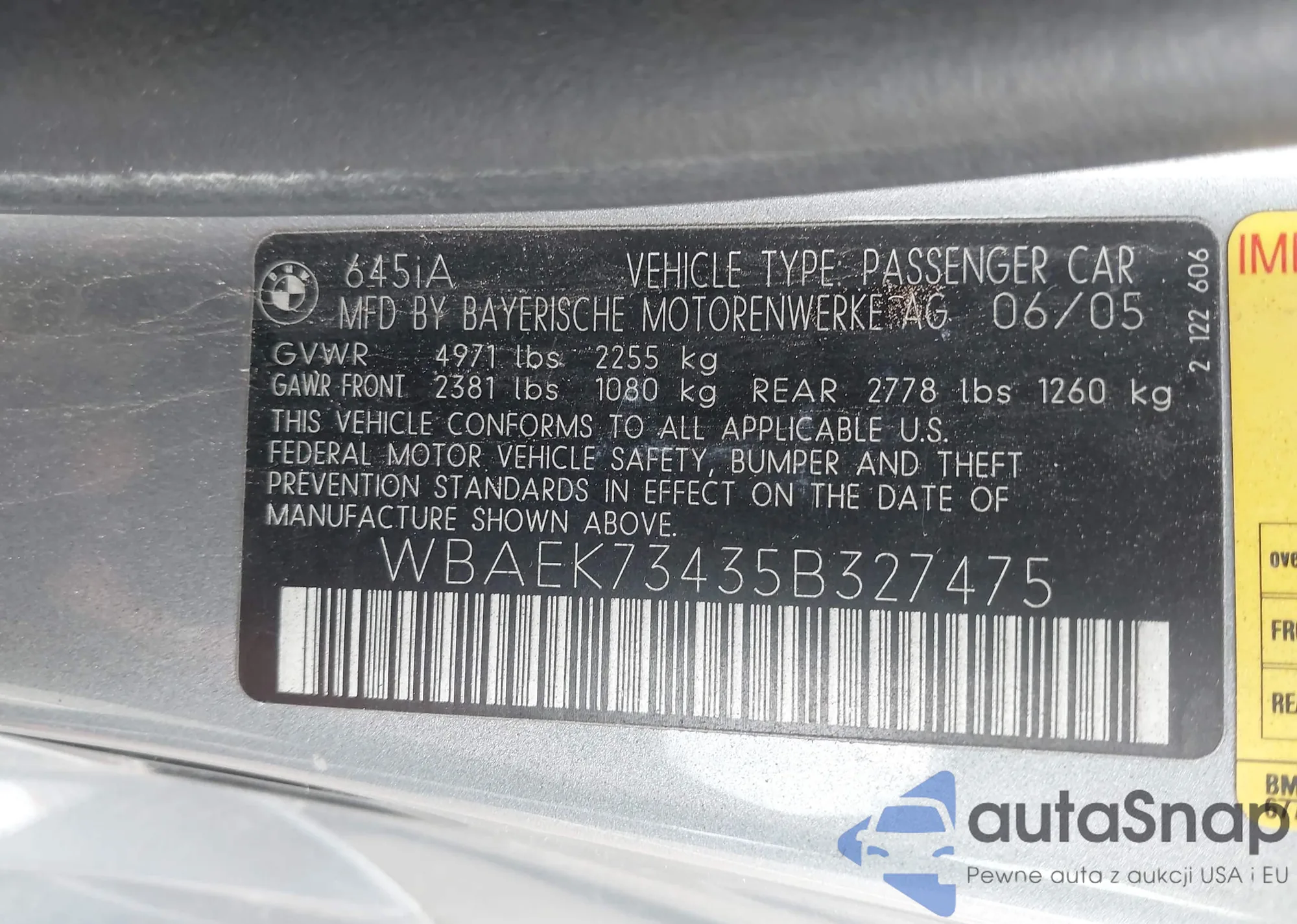 2005 BMW 645Ci z USA, uszkodzony, nr VIN WBAEK73435B327475