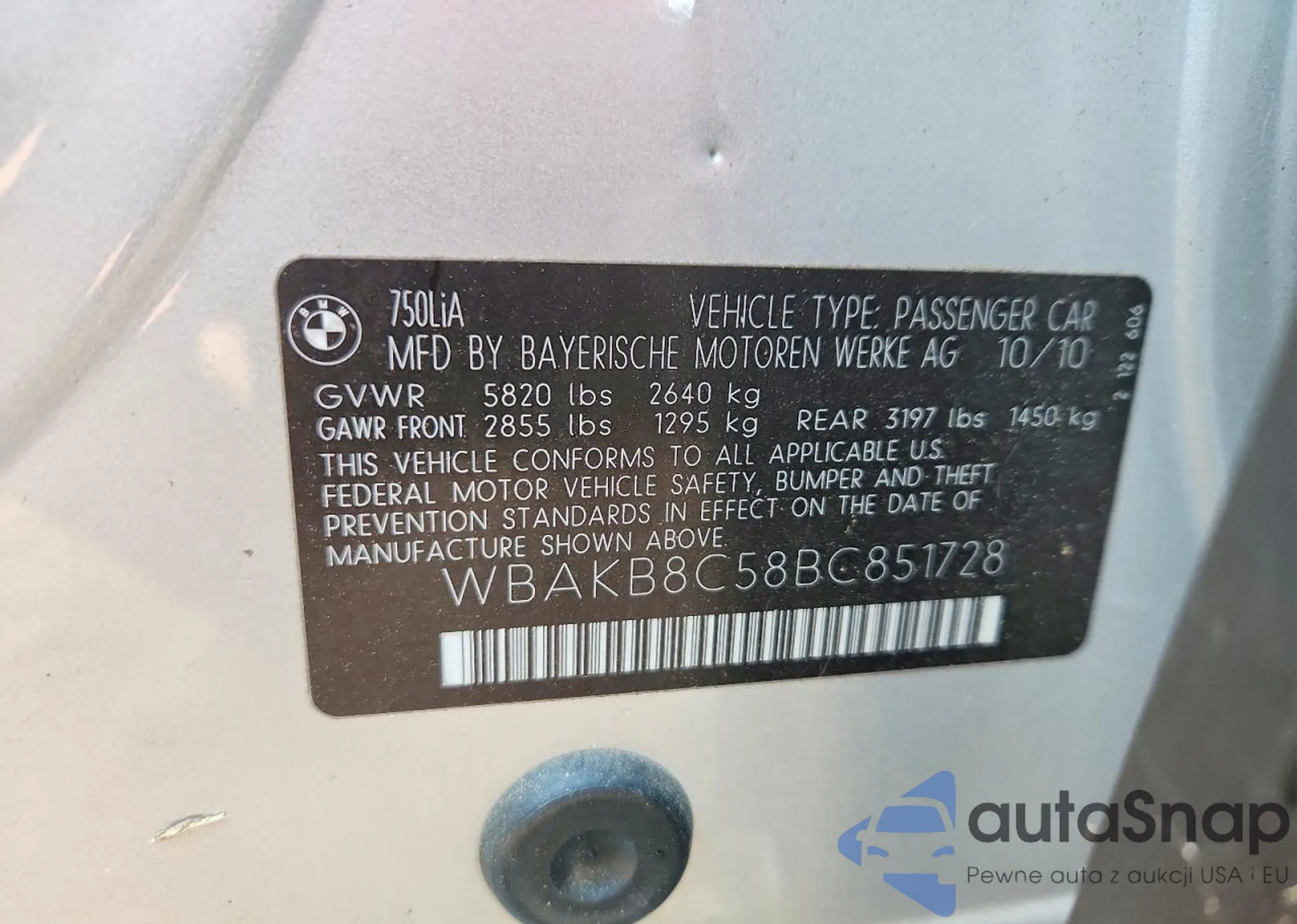 2011 BMW 750 Li z USA, uszkodzony, nr VIN WBAKB8C58BC851728
