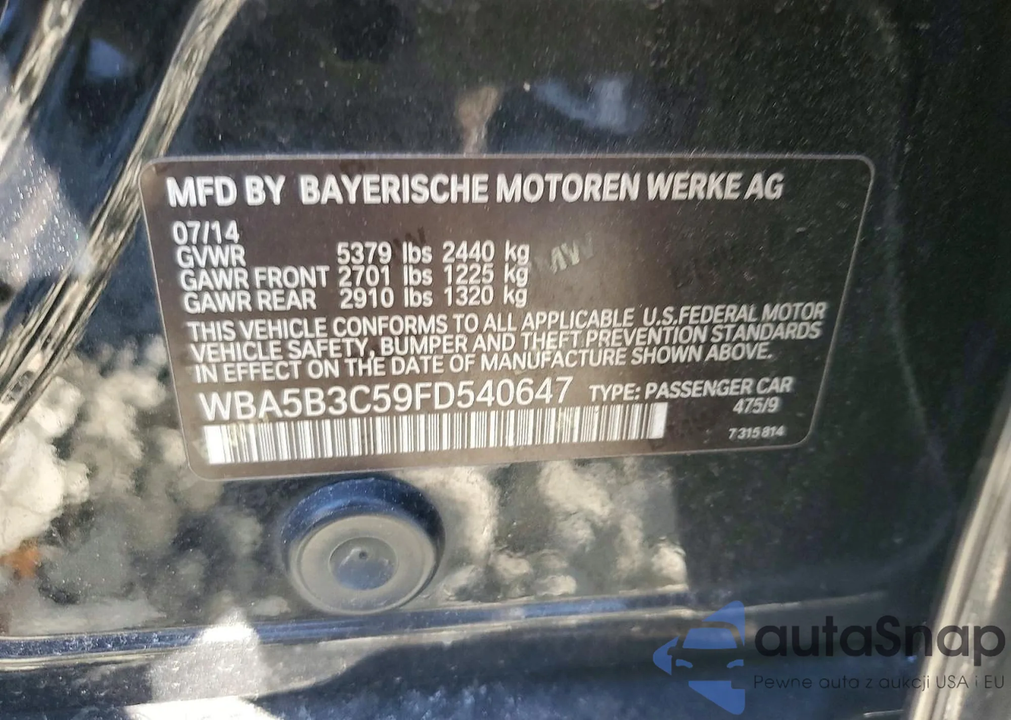 LOT: 72801445 VIN: WBA5B3C59FD540647