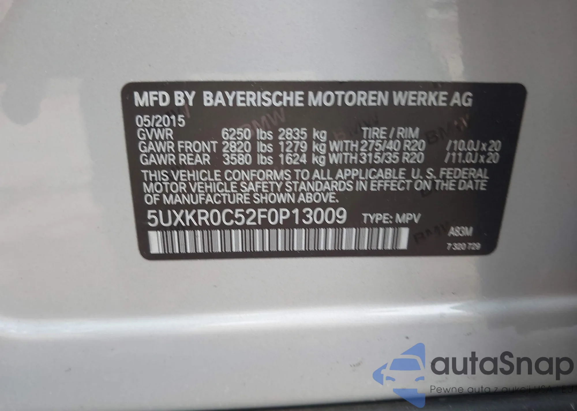 2015 BMW X5 xDrive35I z USA, uszkodzony, nr VIN 5UXKR0C52F0P13009
