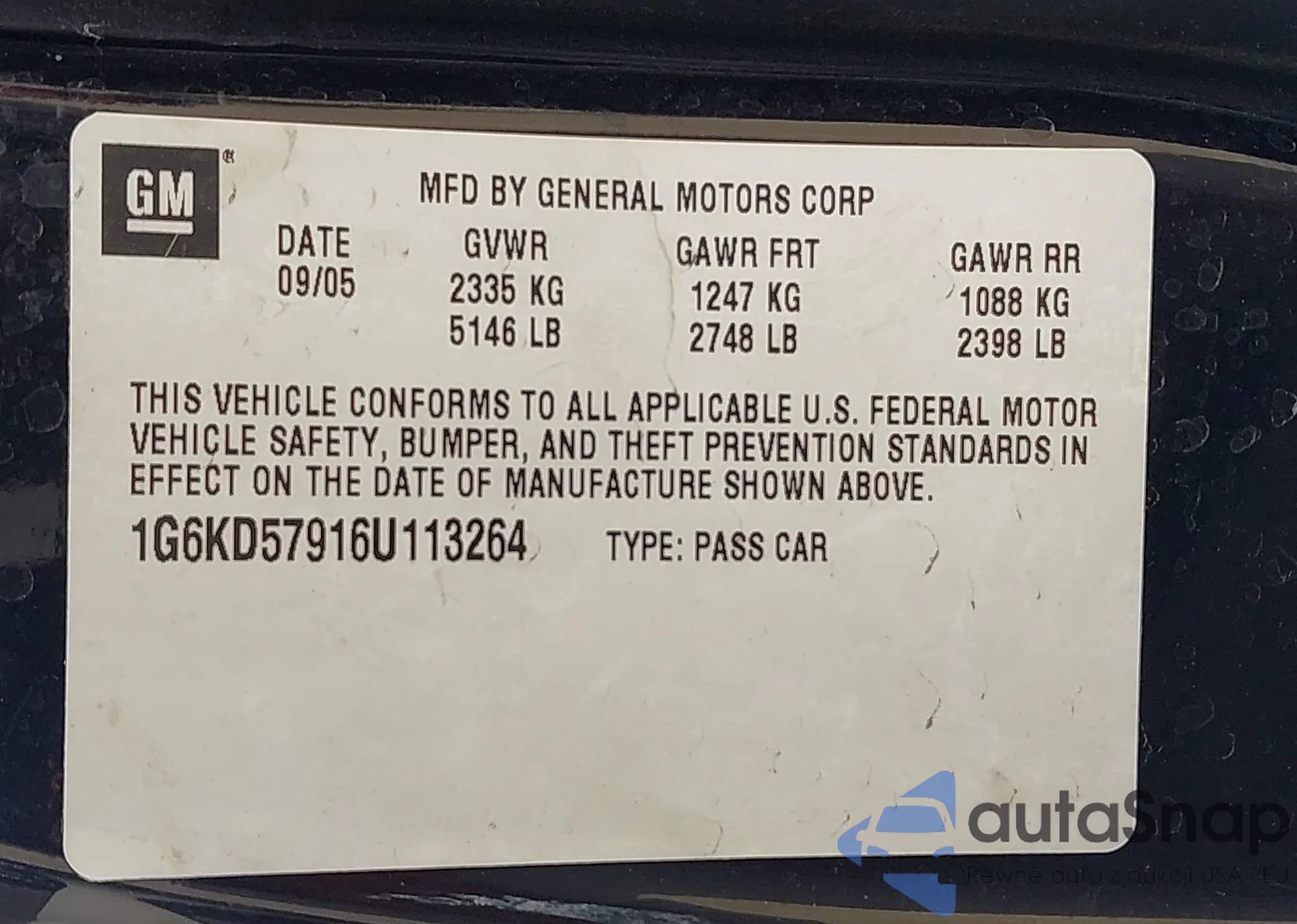 • VIN 1G6KD57916U113264