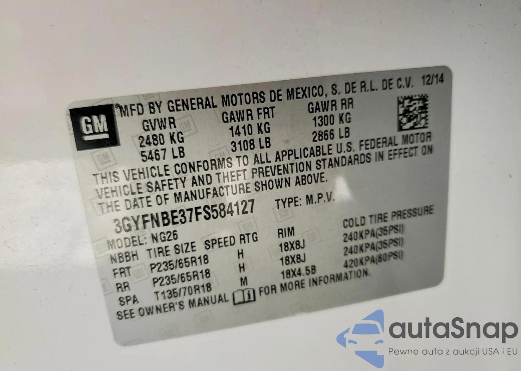 LOT: 44120933 VIN: 3GYFNBE37FS567022