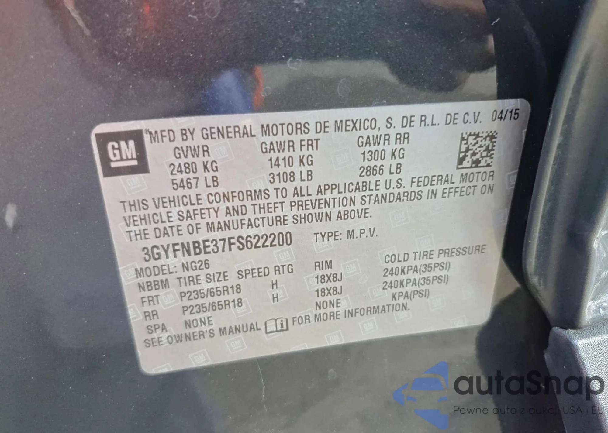 LOT: 96322525 VIN: 3GYFNBE37FS622200