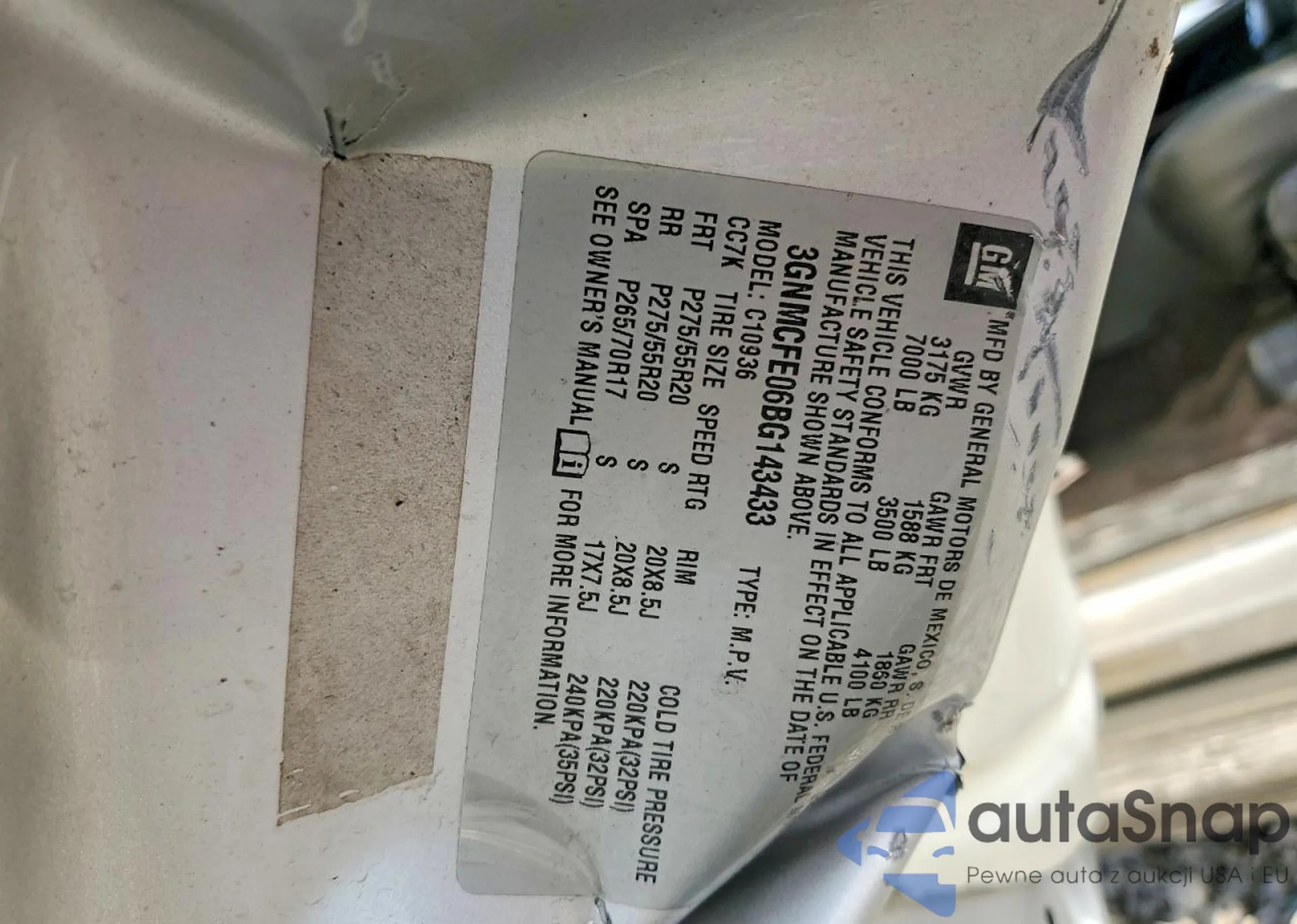 LOT: 74882315 VIN: 3GNMCFE06BG143433