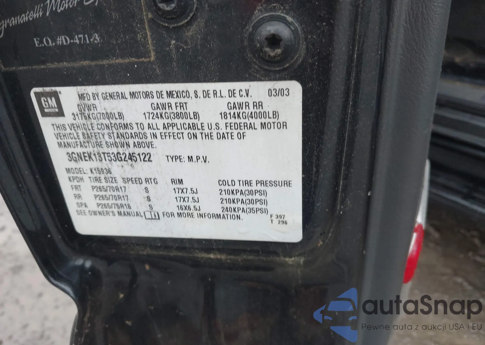• VIN 3GNEK13T53G245122