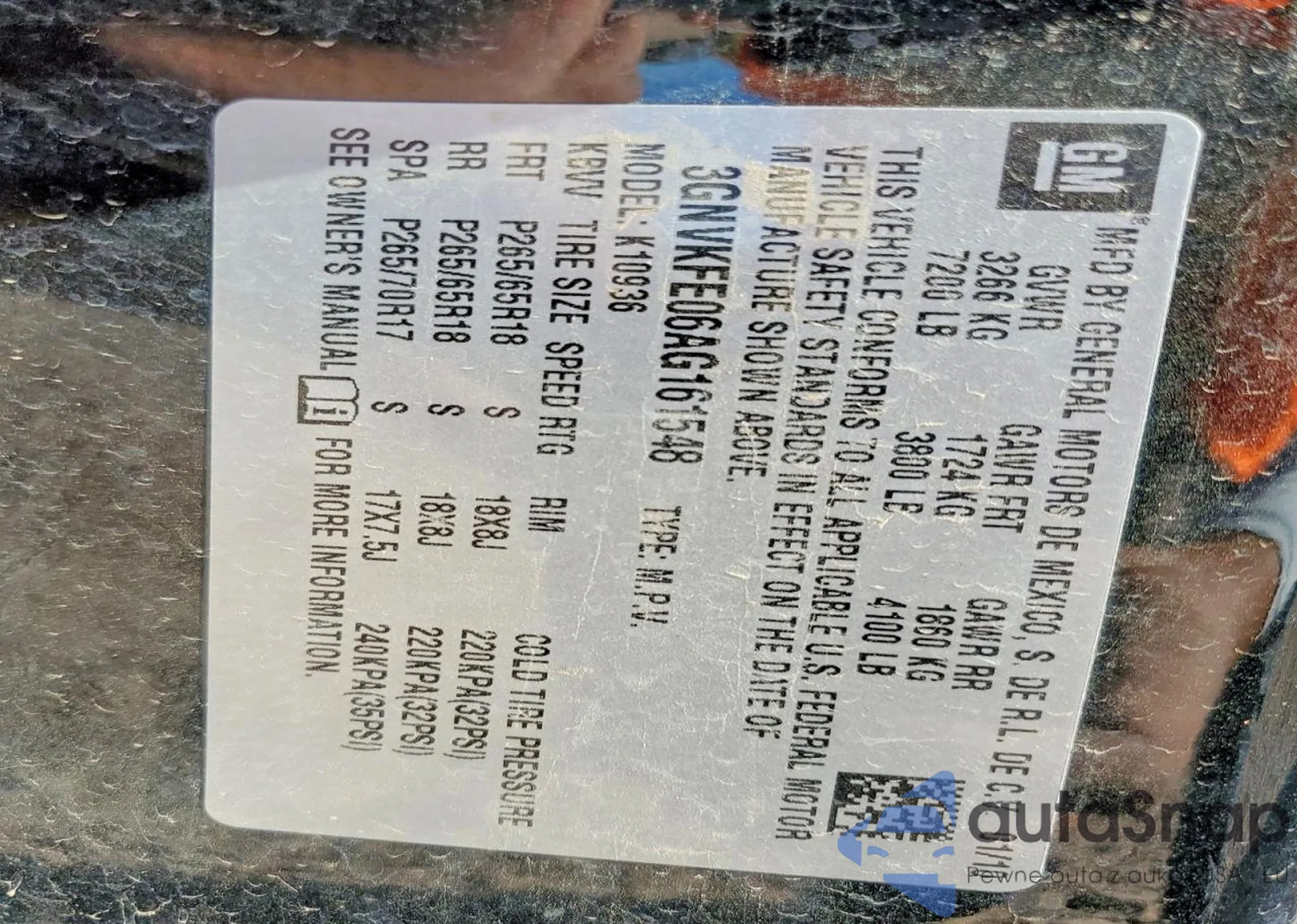 LOT: 76637415 VIN: 3GNVKFE06AG161548