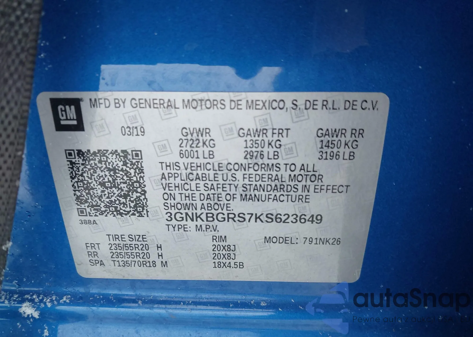 • VIN 3GNKBGRS7KS623649