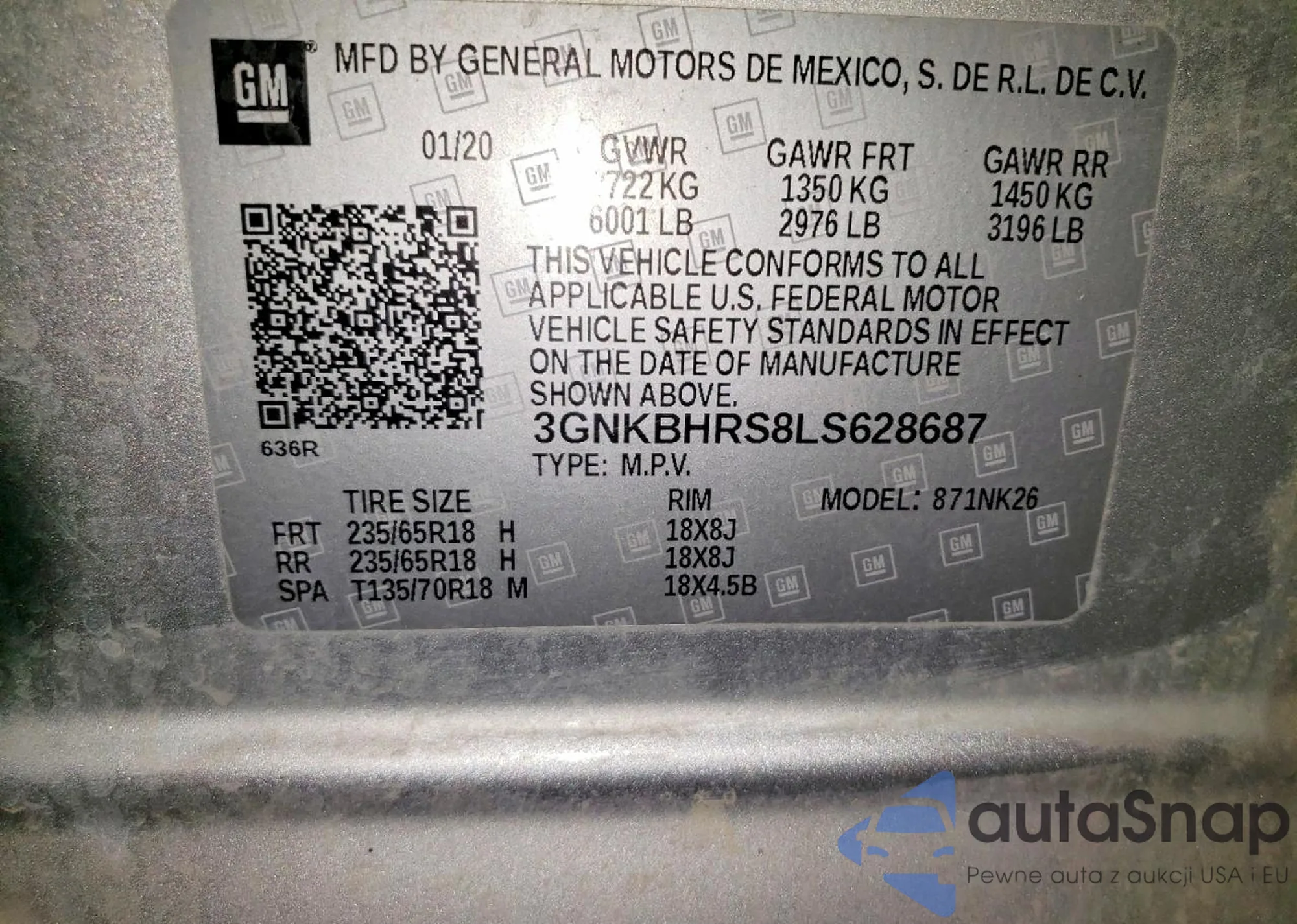 LOT: 99369405 VIN: 3GNKBHRS8LS628687
