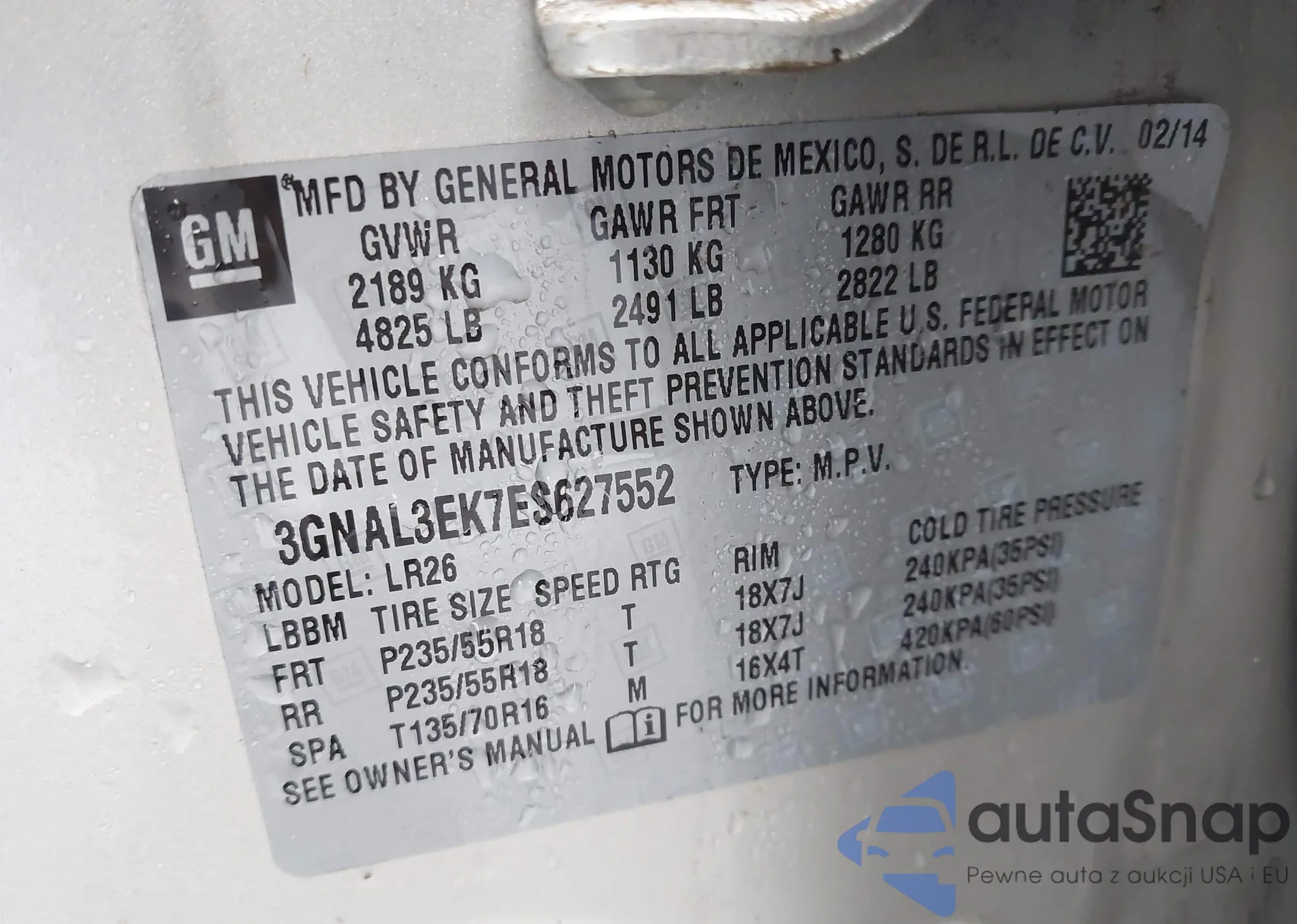 • VIN 3GNAL3EK7ES627552