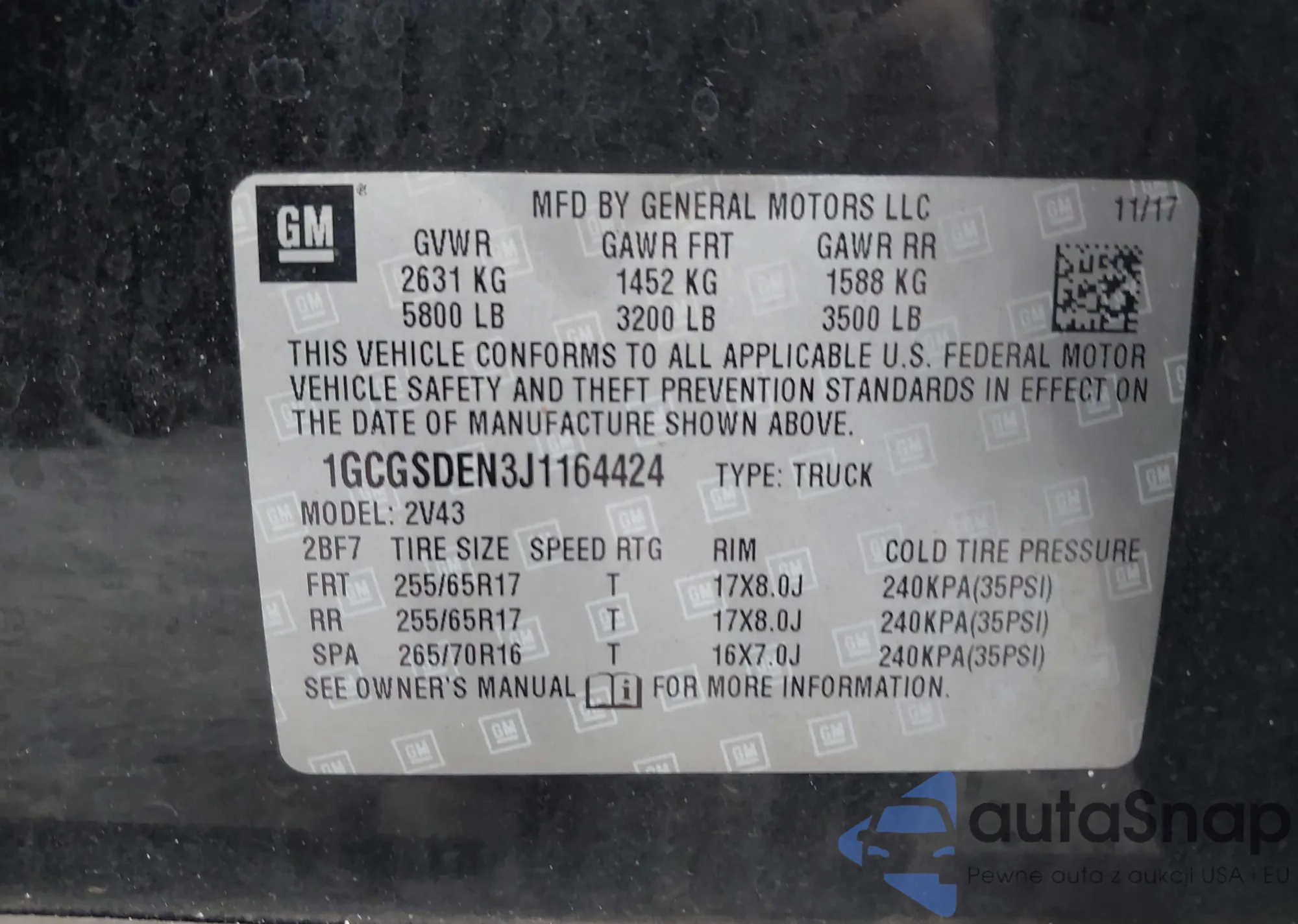 • VIN 1GCGSDEN3J1164424