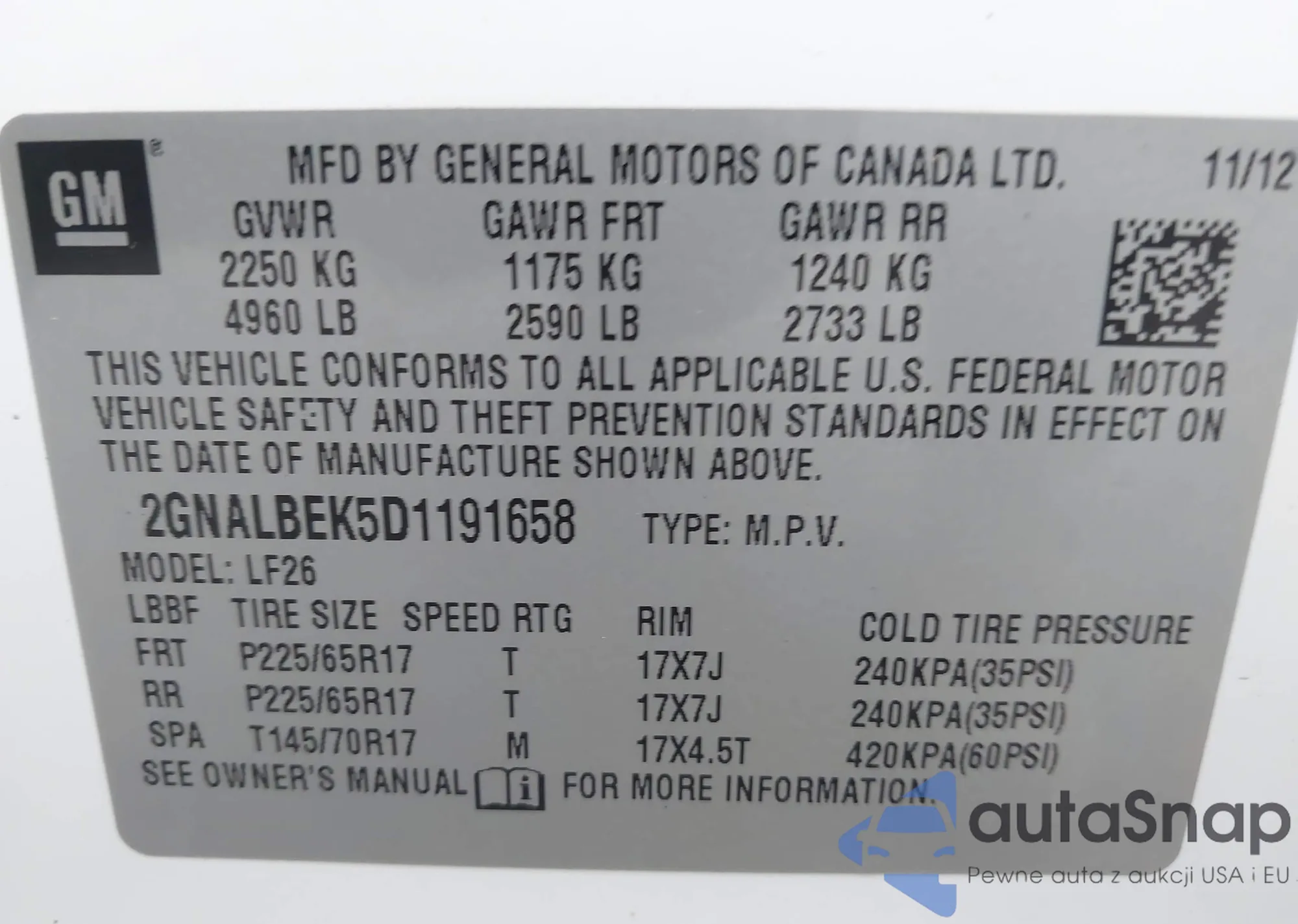 • VIN 2GNALBEK5D1191658