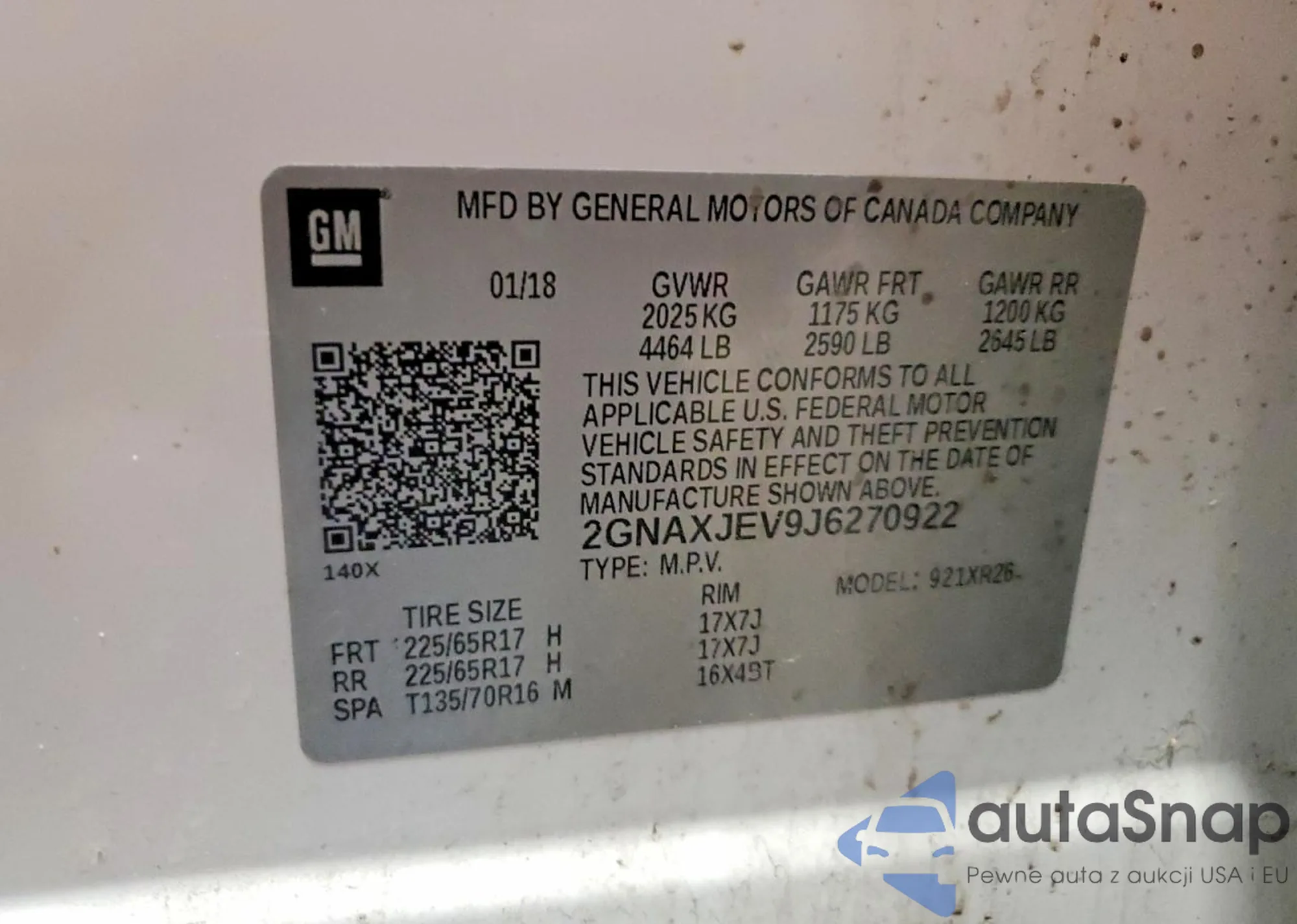 LOT: 99989785 VIN: 2GNAXJEV9J6270922