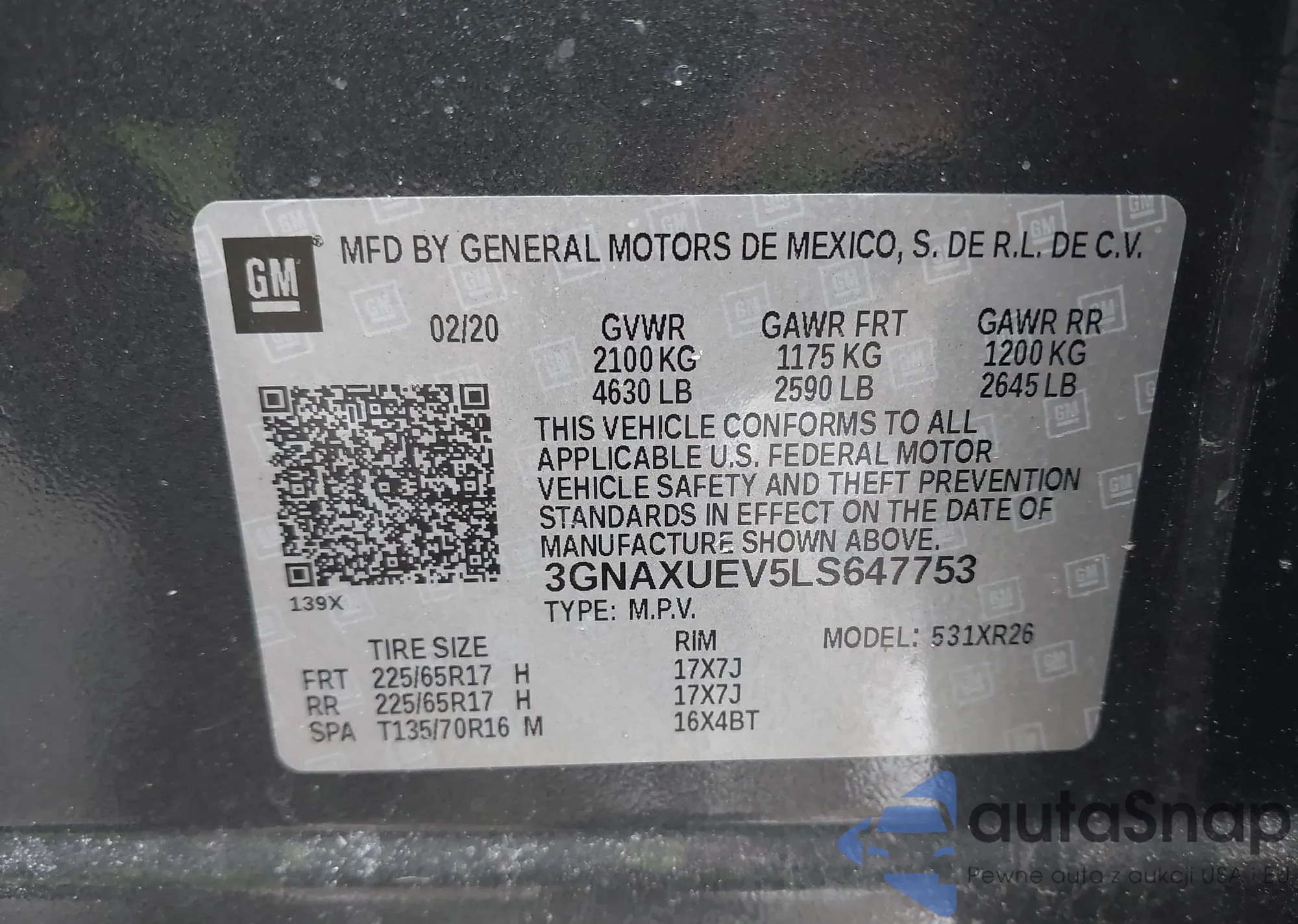 • VIN 3GNAXUEV5LS647753