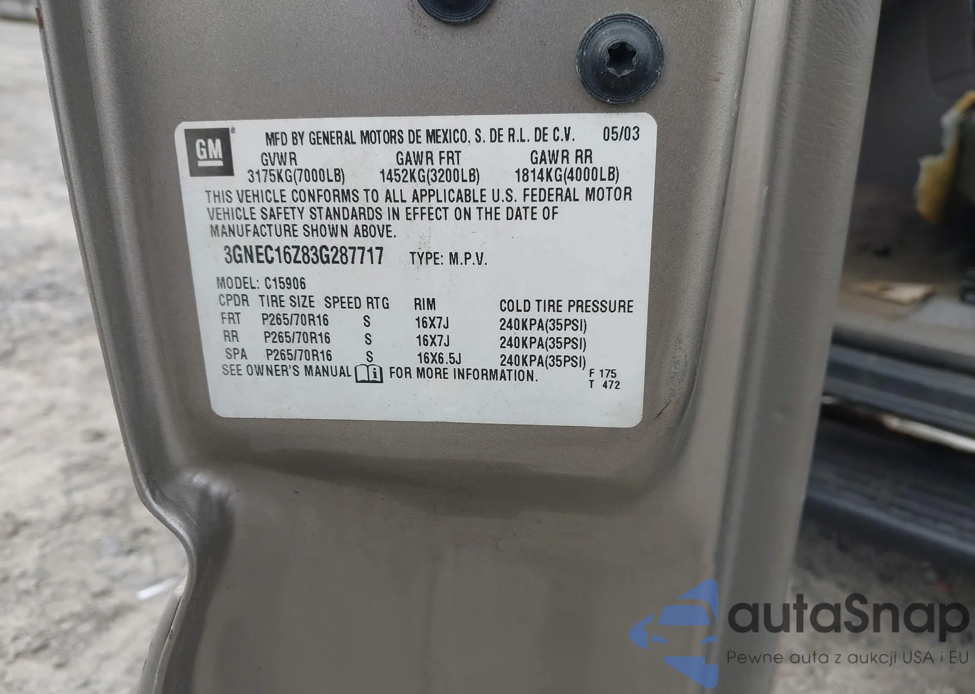 • VIN 3GNEC16Z83G287717