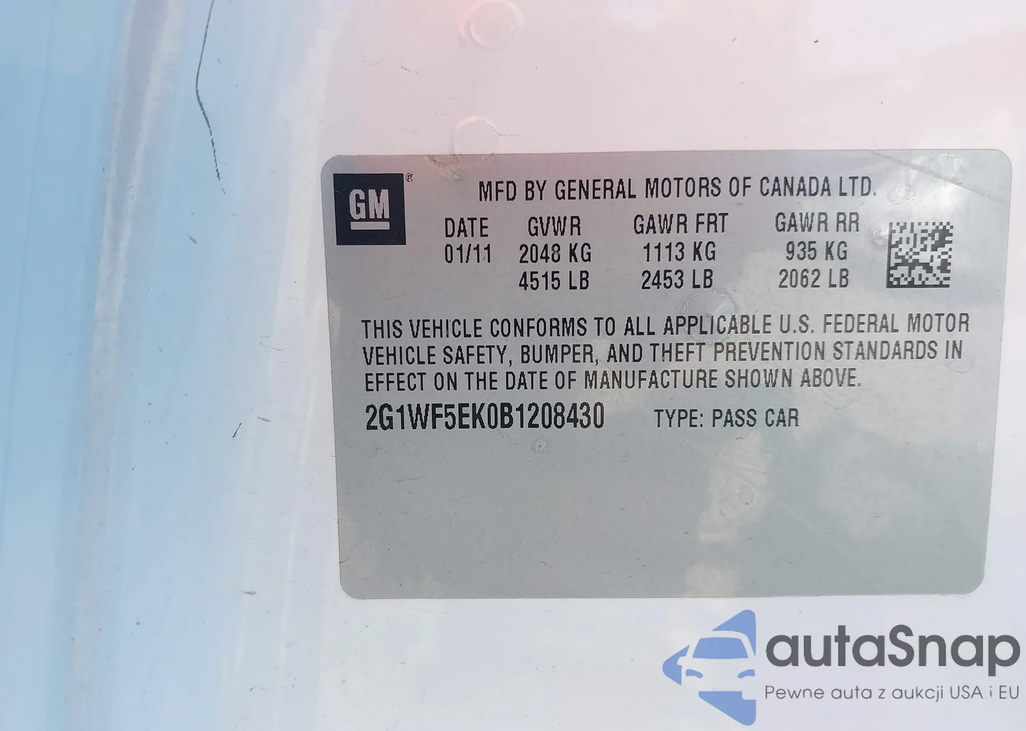 LOT: 44308358 VIN: 2G1WF5EK0B1208430