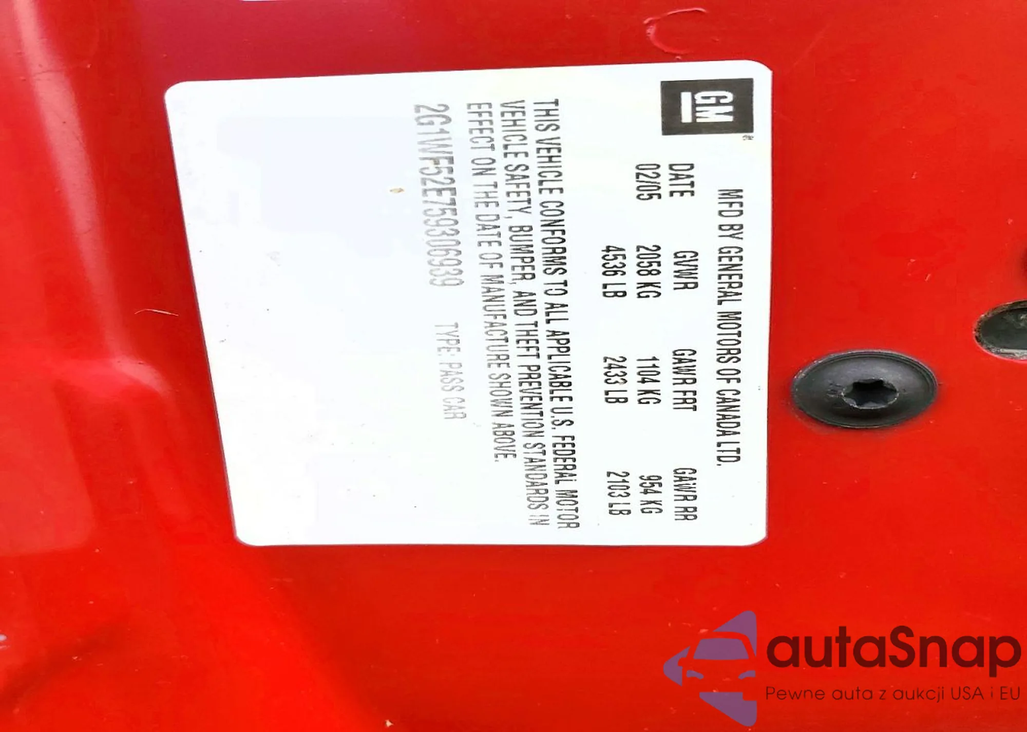 LOT: 92426075 VIN: 2G1WF52E759306939