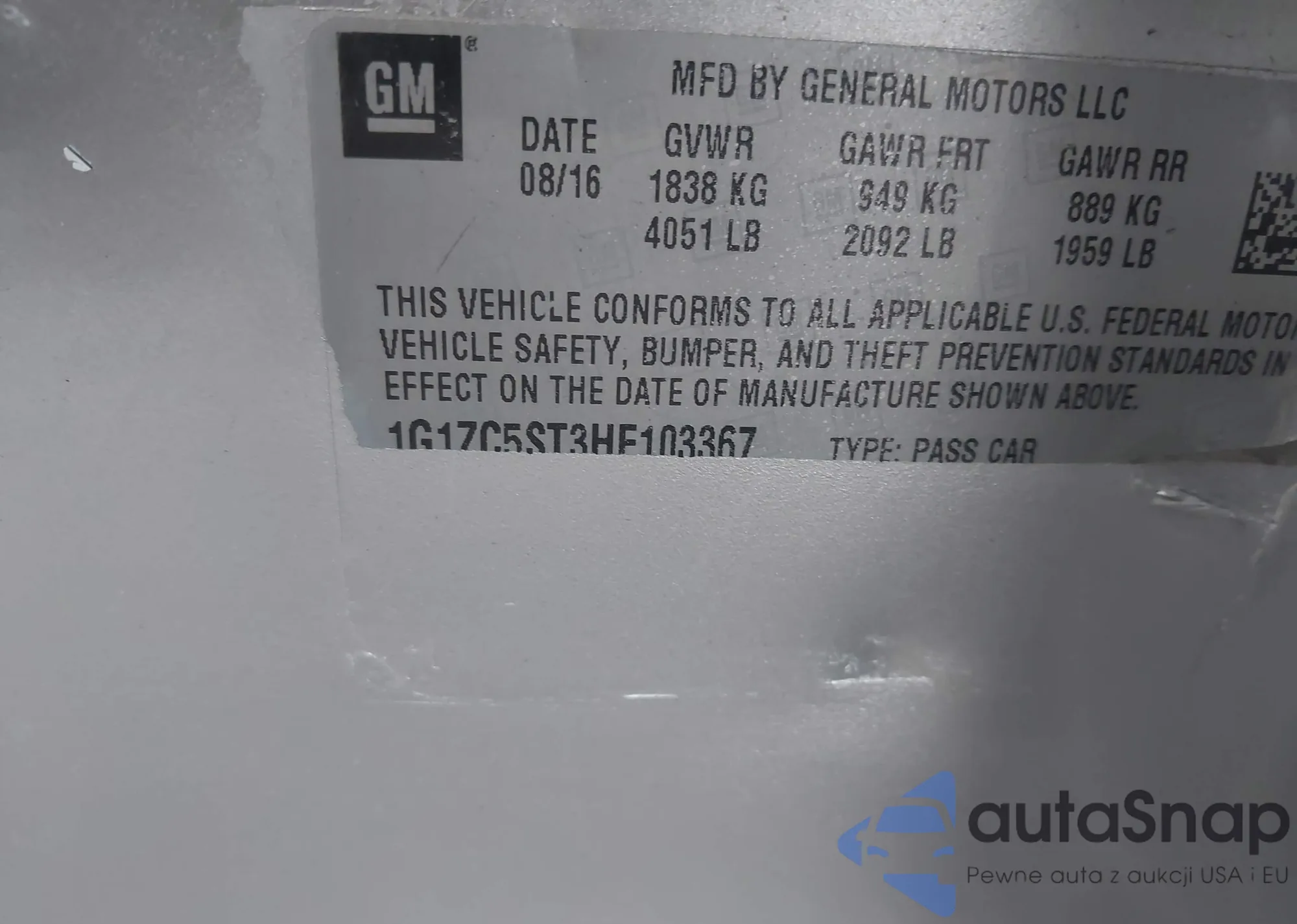 • VIN 1G1ZC5ST3HF103367