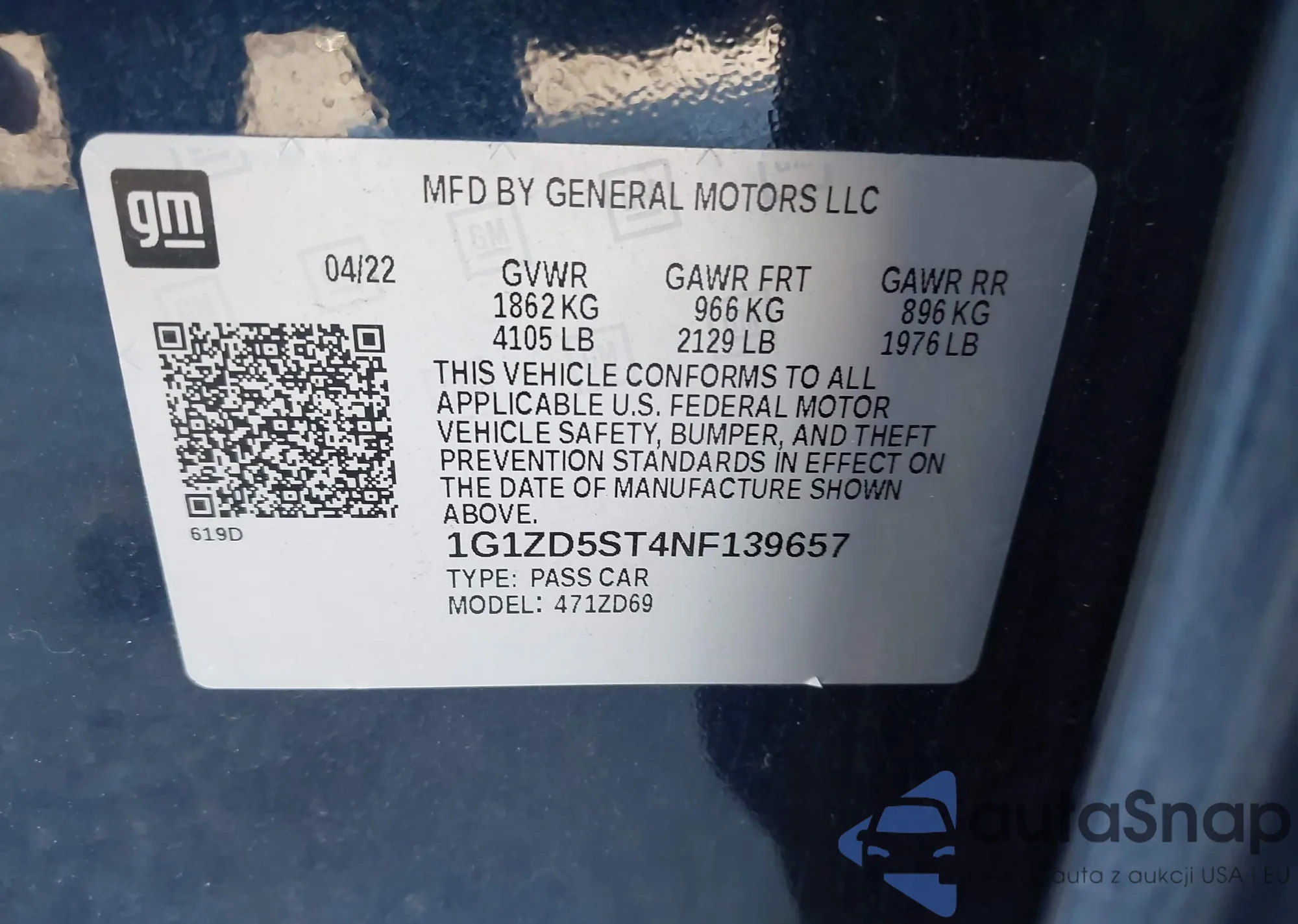 LOT: 43838618 VIN: 1G1ZD5ST4NF139657