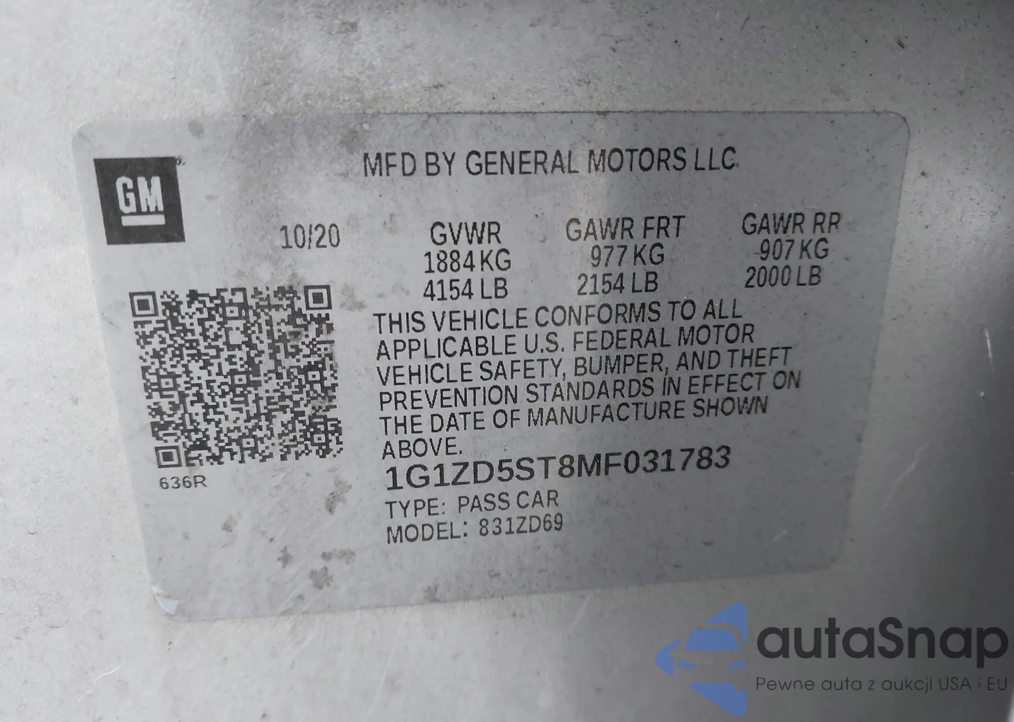 • VIN 1G1ZD5ST8MF031783