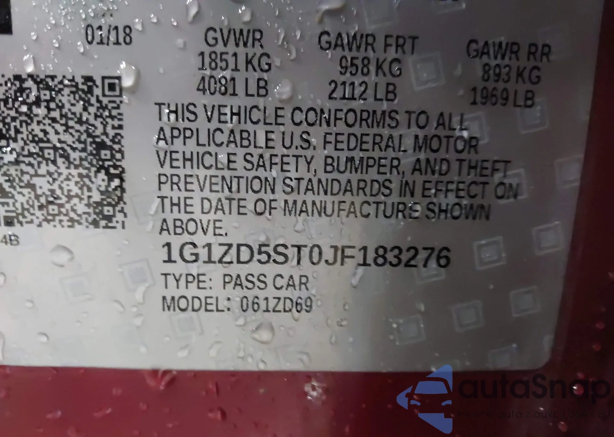LOT: 44376256 VIN: 1G1ZD5ST0JF183276